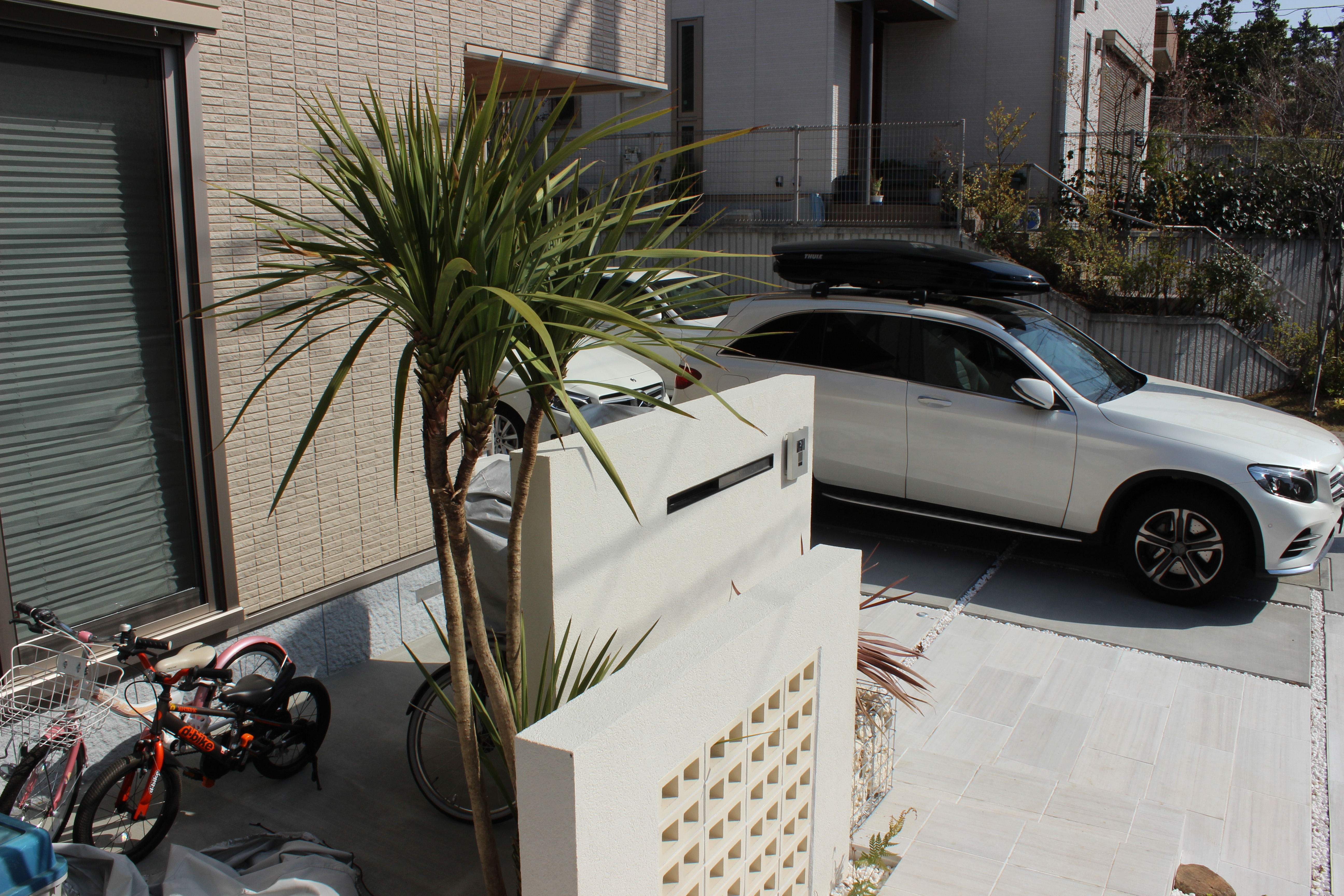 そして完成したお庭がこちらです(^^♪もとは自転車置き場が駐車スペースの後ろになっていたので出し入れが大変という事でしたので