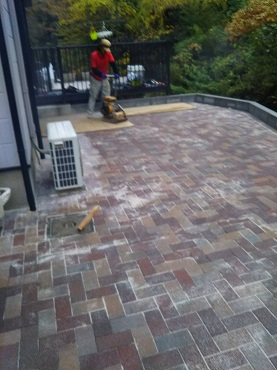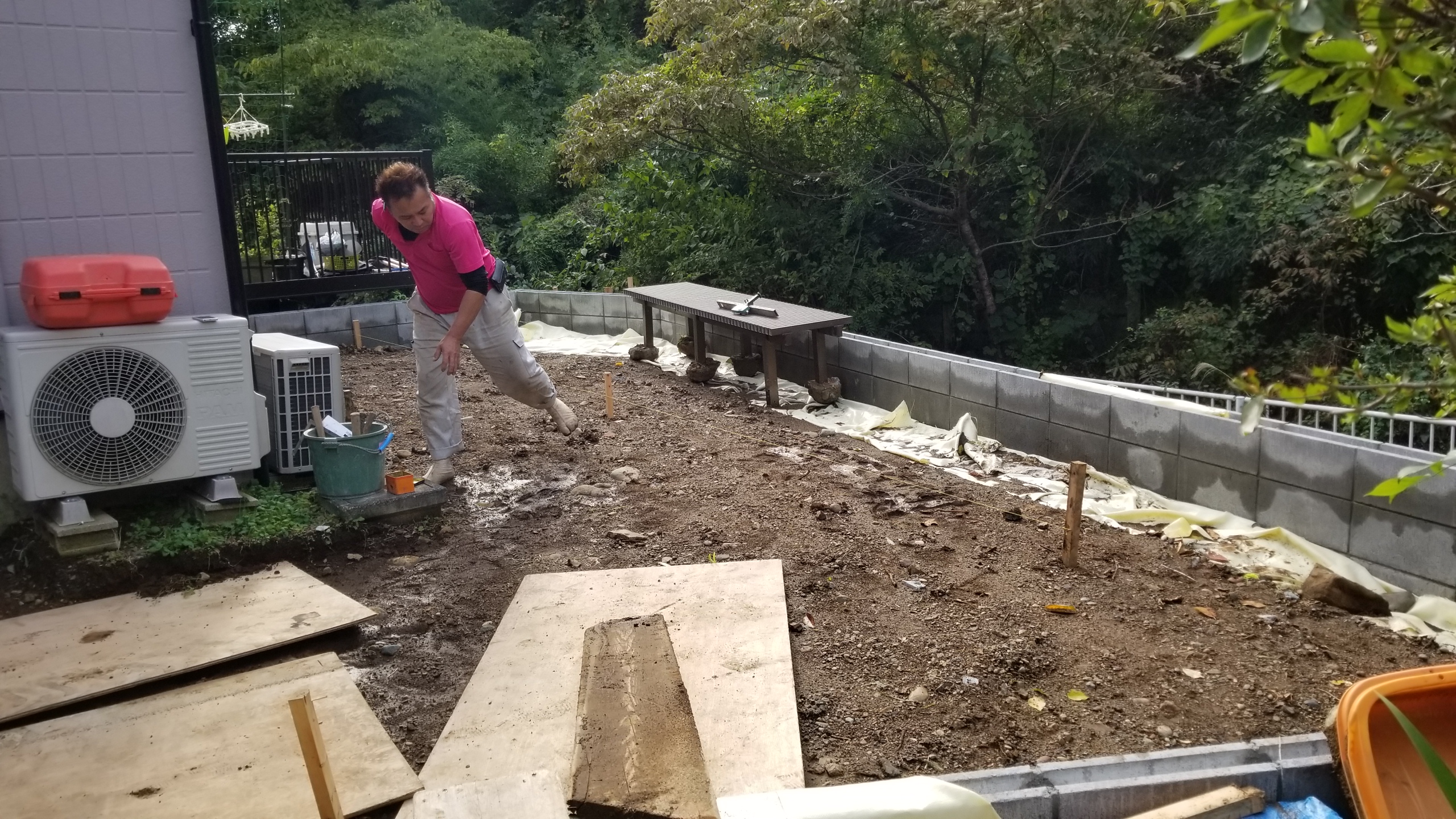 宏樹君がプレートコンパクターを自走し私がベニヤ板をずらしていて、