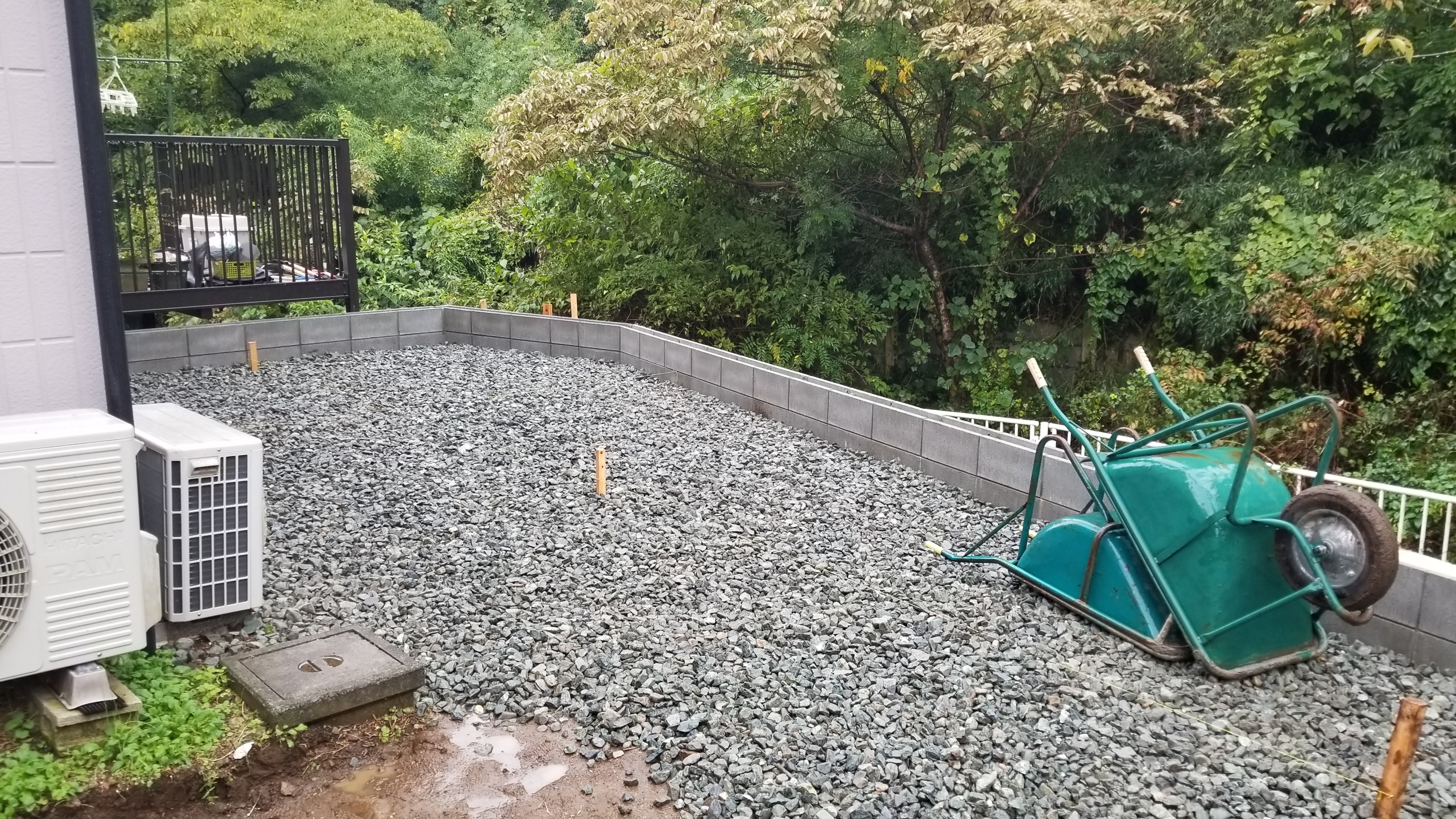 路床が雨でよい状態ではなかったので今回は大きめなグリ石を下地に敷き詰めました。