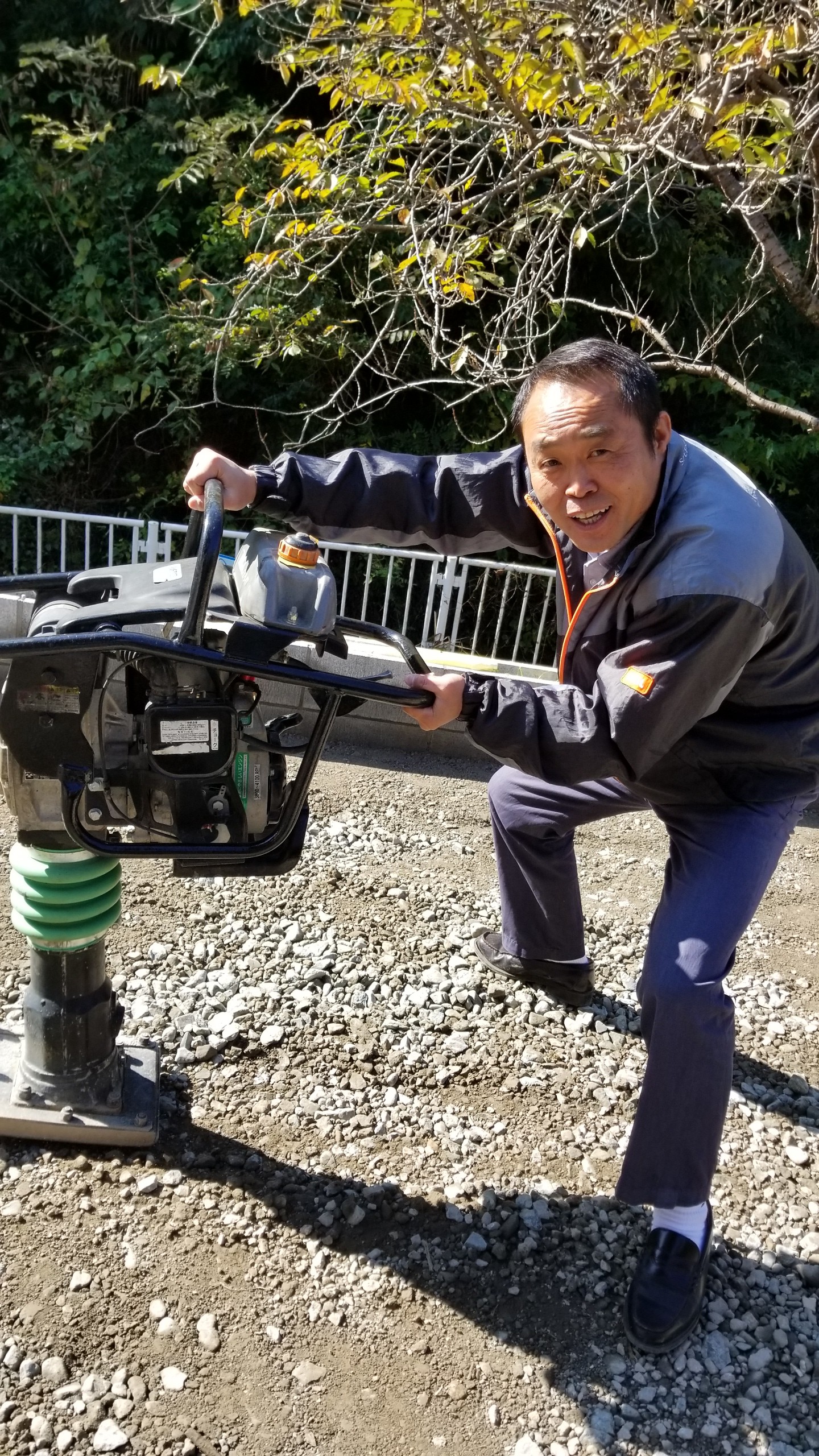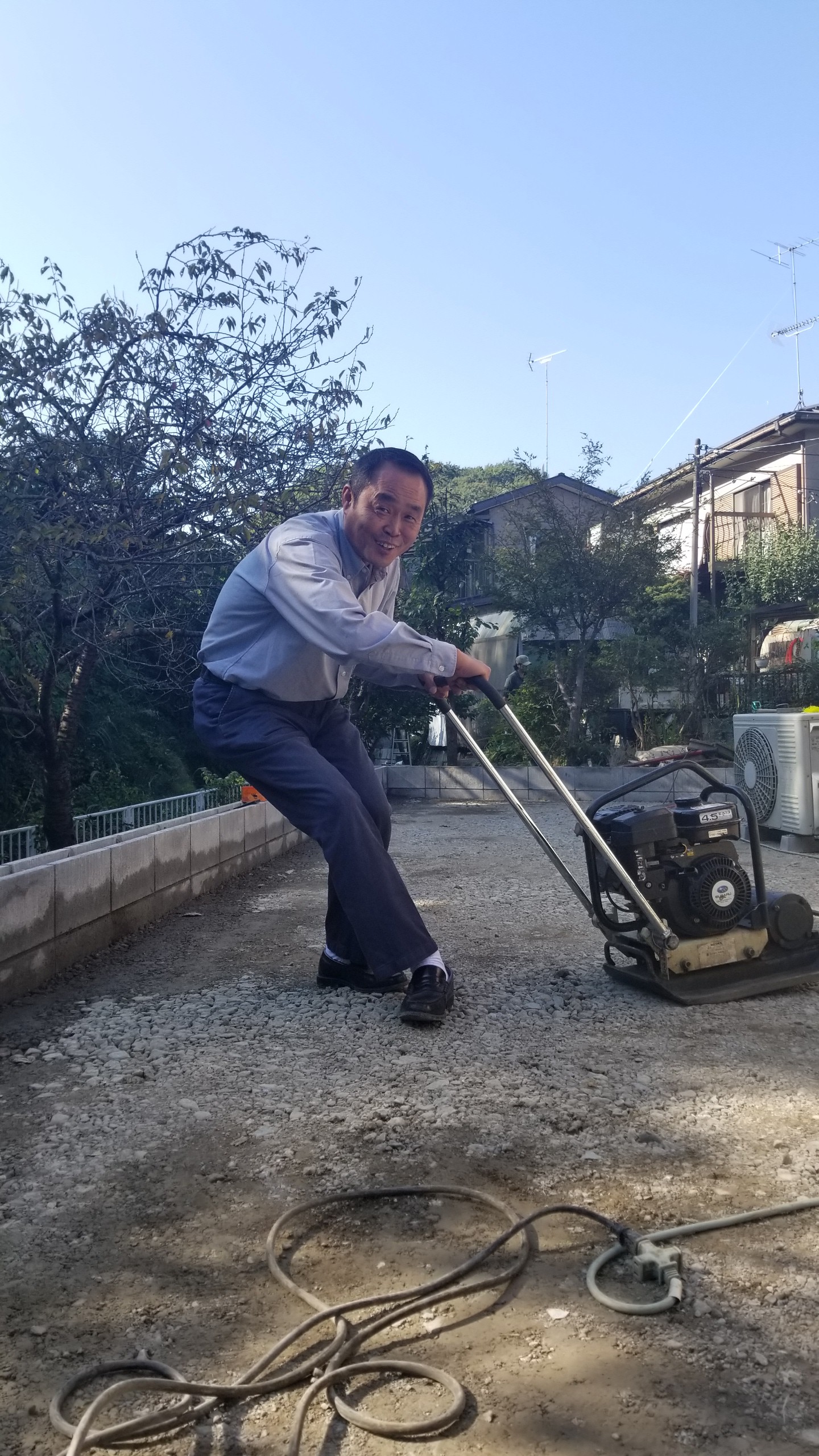 仕上げはプレートコンバクタという振動的荷重の転圧機を使い平坦に仕上げ作業