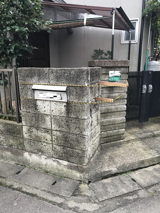 お施主様が応急処置でトラロープを使って塀が倒れないように縛っていたのです(; ・`д・´)!!