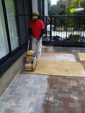 プレートコンパクターという転圧器でベニヤ板の上を移動して均一に転圧