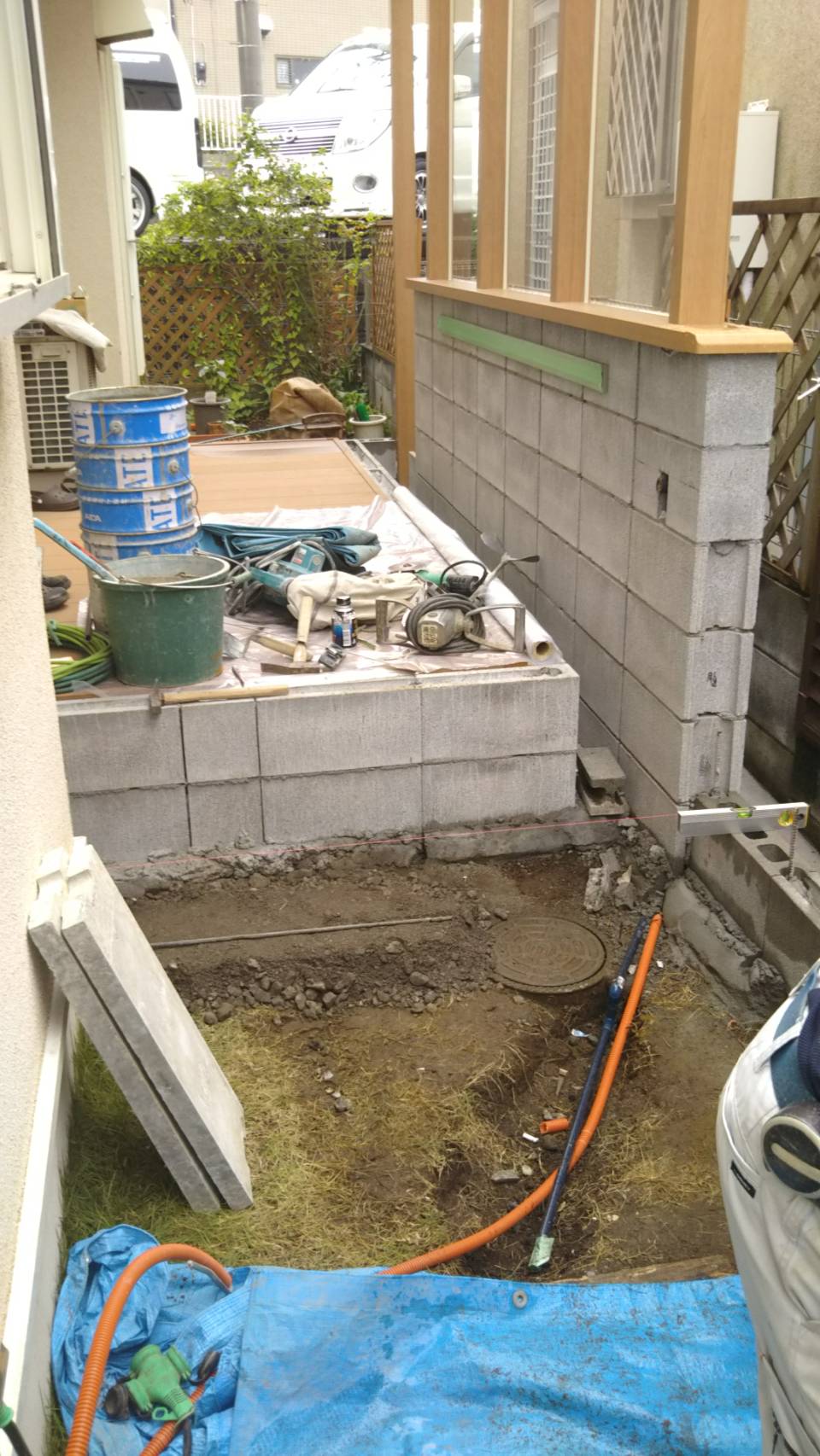 腰壁となる部分は下地ブロックを積み、デッキとの隙間はタイルが貼れるように躯体を加工していきます。
