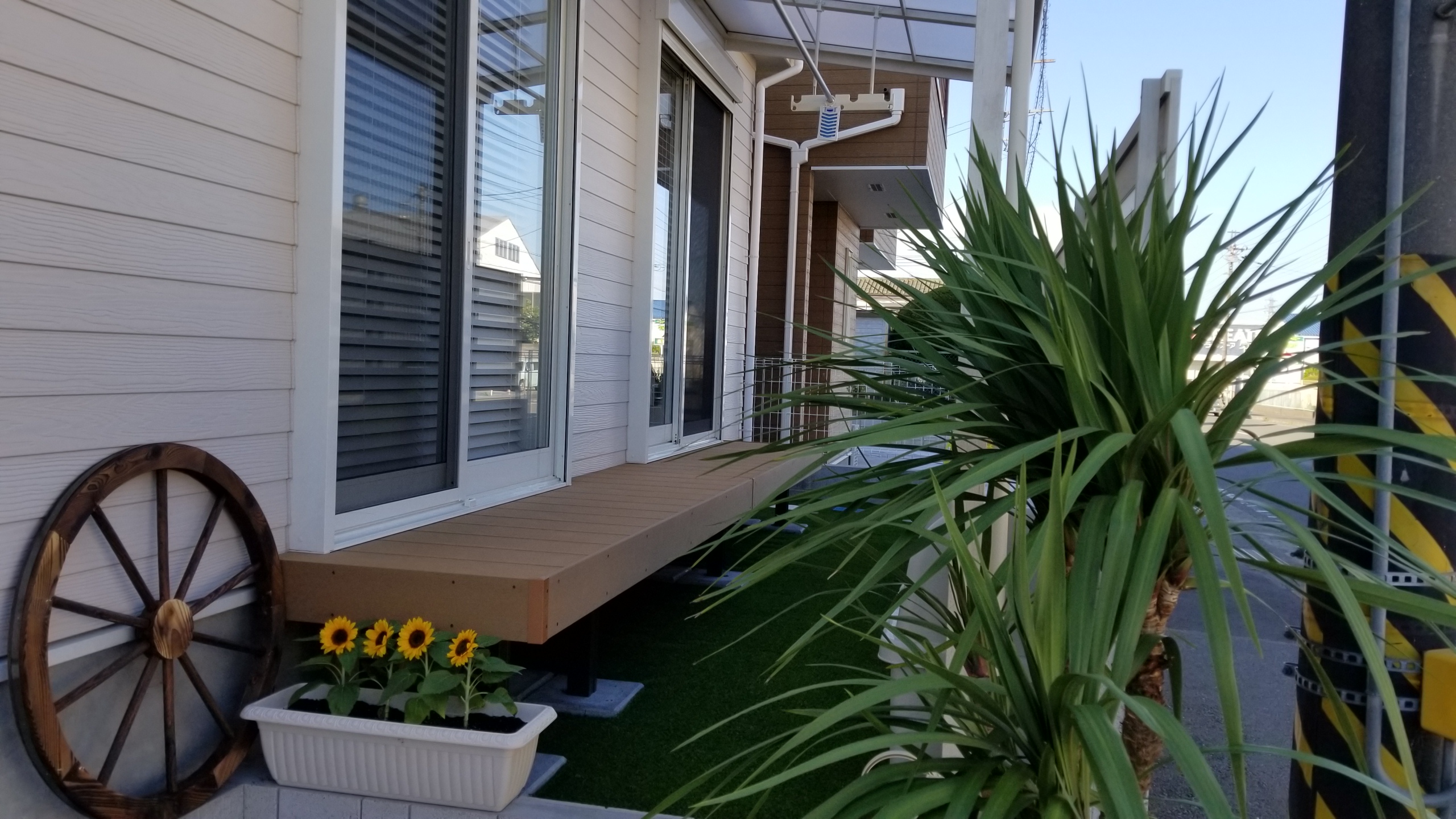 人気の樹脂タイプのウッドデッキ! 使い方や用途を打ち合わせさせていただき大きさや形をプランしています。