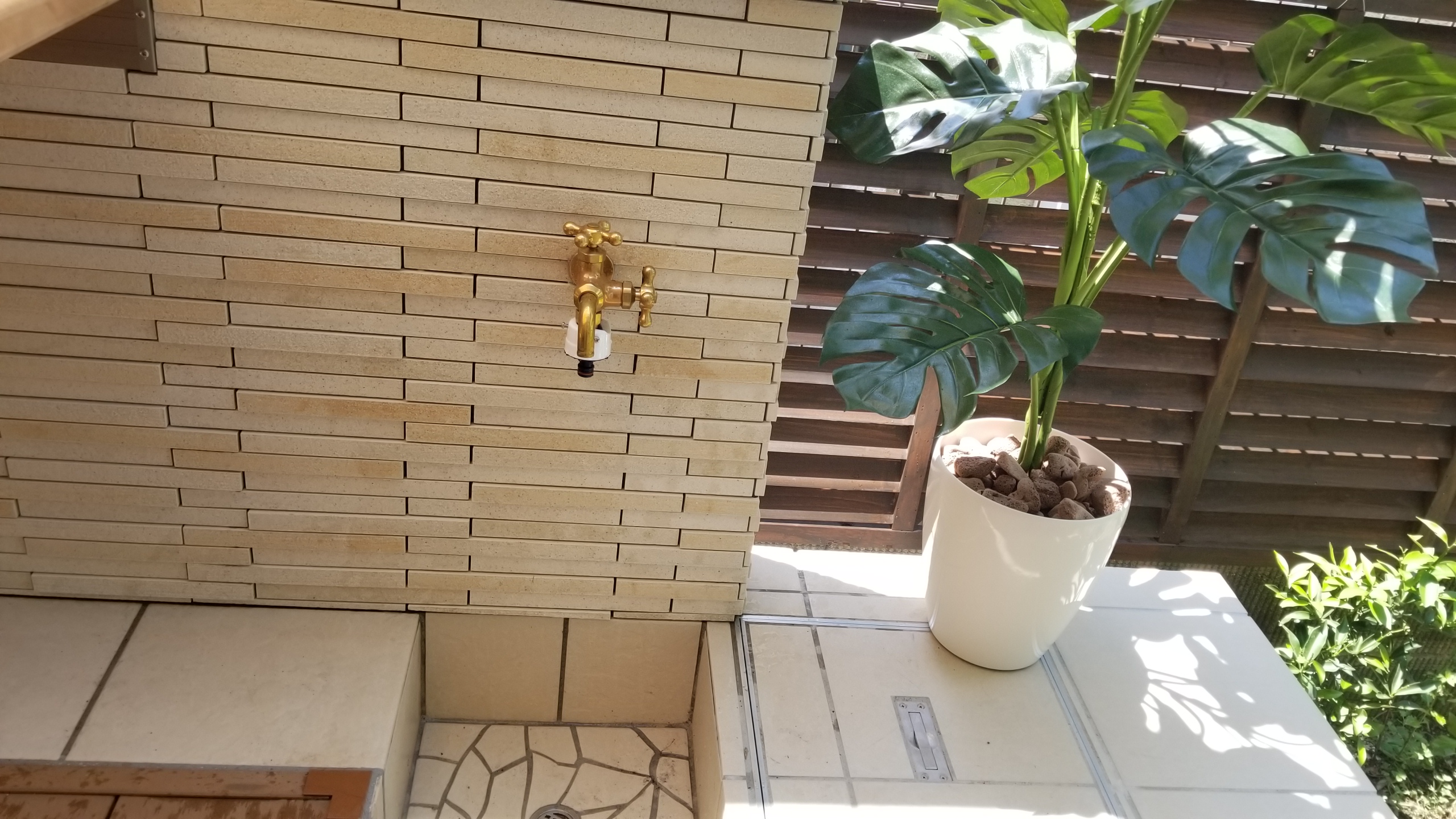 立水栓もテラス内に移動して水受けはタイルを加工、オリジナルの外水栓も人気があります。