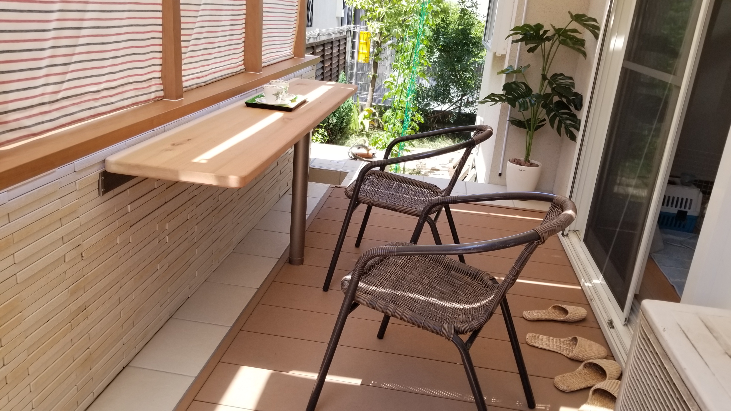 テラスの大きさは、横幅2.7m 出幅2.1m、テーブルを置き椅子を4脚置けるくらいの大きさです。
