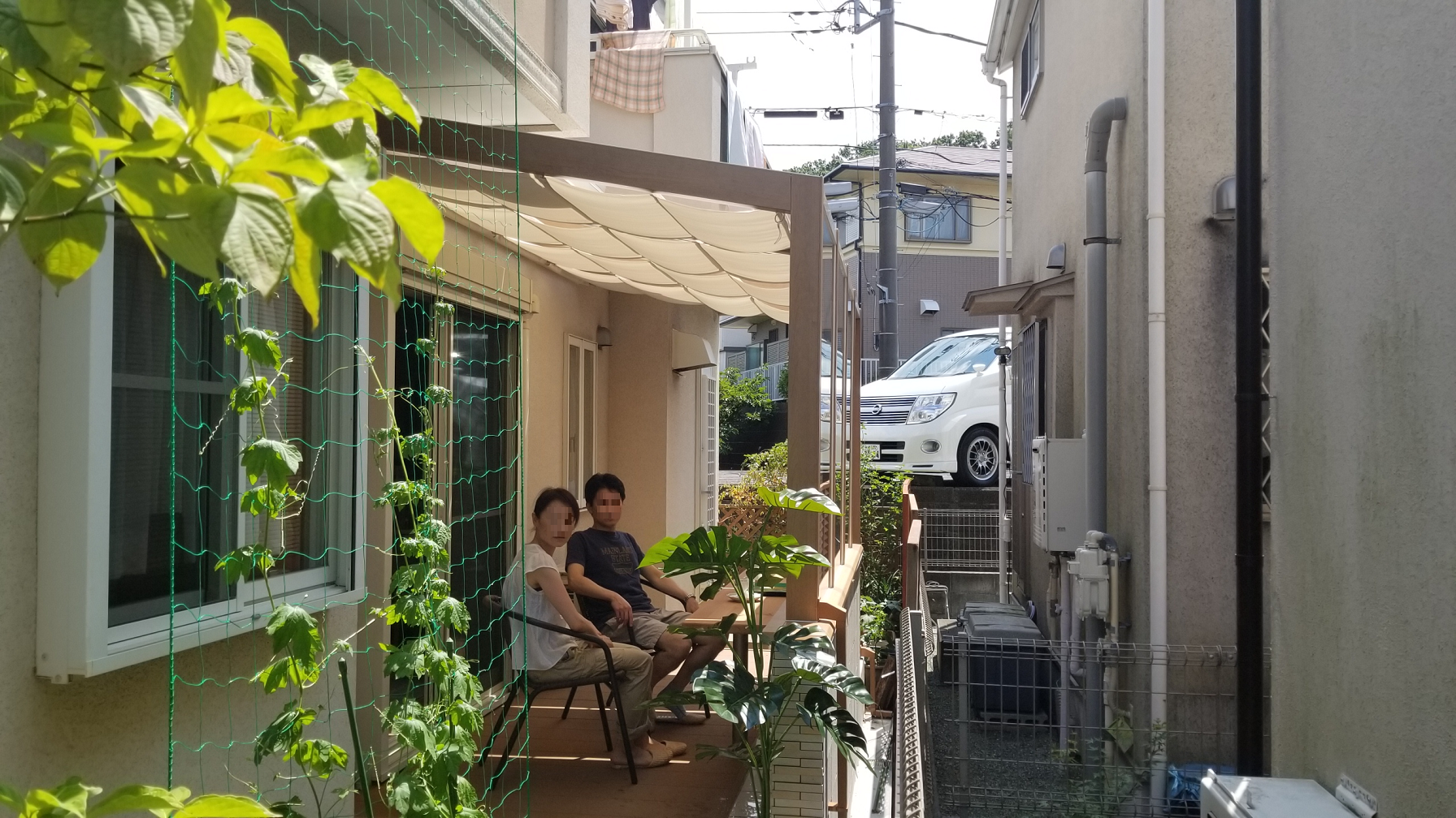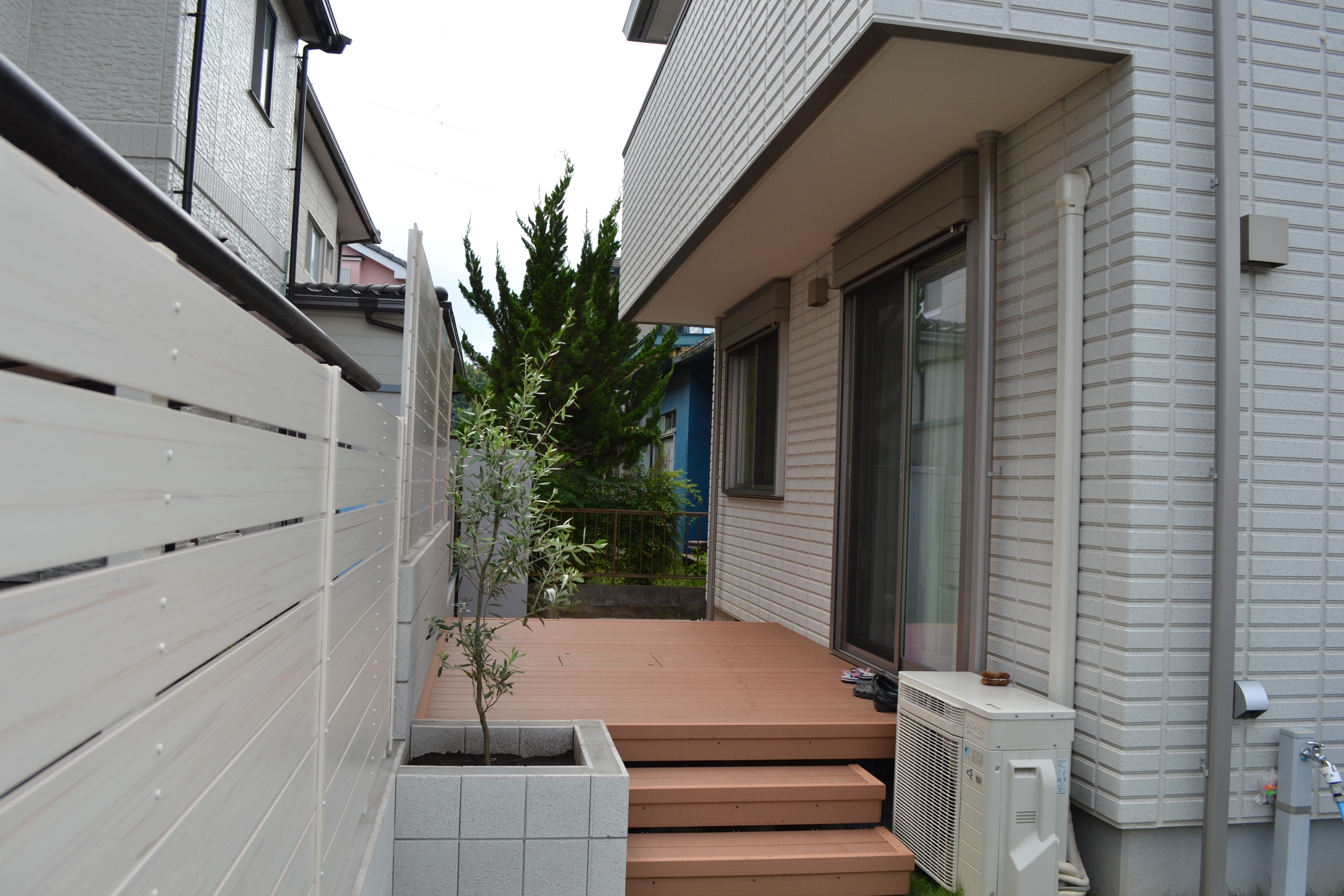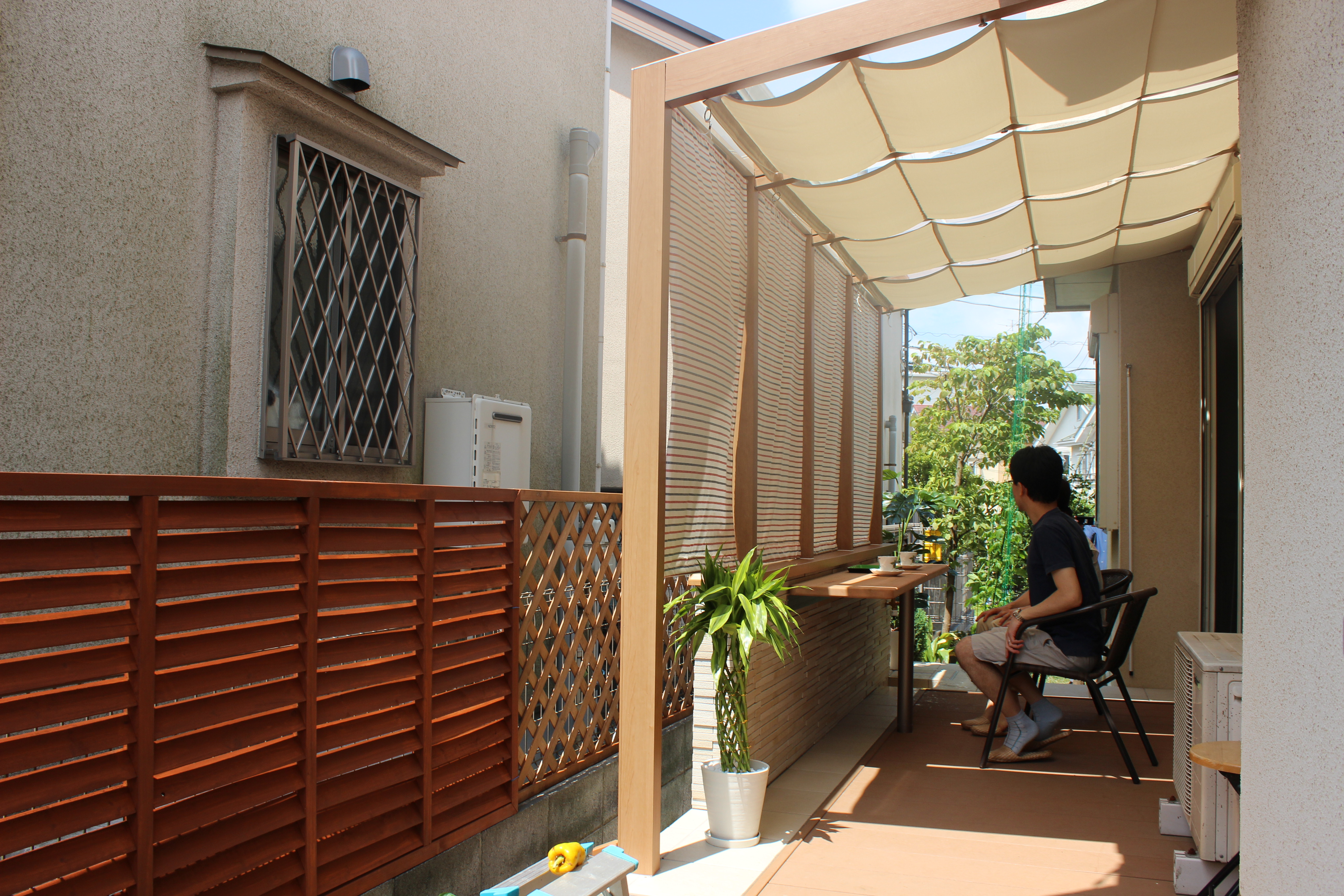 もともと樹脂製のウッドデッキが施工してあったお庭に、目隠しと屋根が欲しいとのご相談から始まりました。