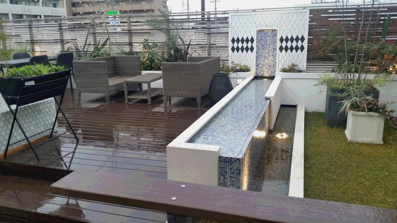 最近オープンしたばかりのショールーム、エクステリアメーカーだけに、タカショーの商品をふんだんに使って見事な ショールームとなっています。