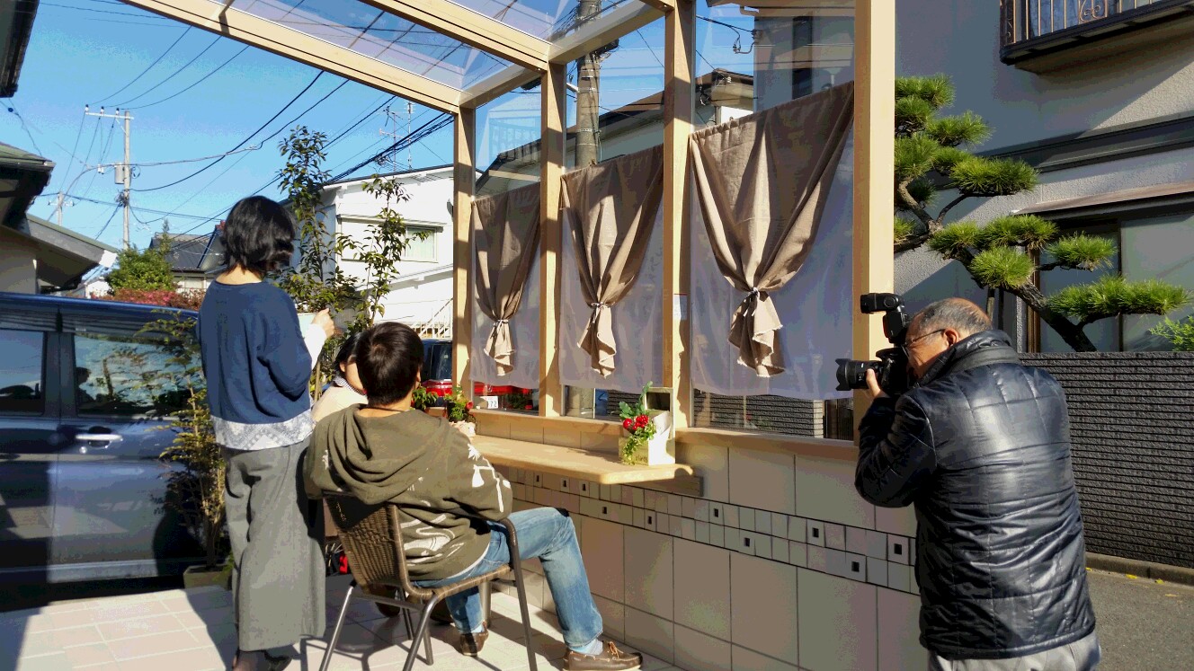天気も良く撮影日和、以前より撮影日は伝えてありましたので現場に着くとテラス屋根ココマの前面ガラスに、お洒落な目隠しのカーテン、カフェシェードを可愛く装飾中の奥様が居ました。