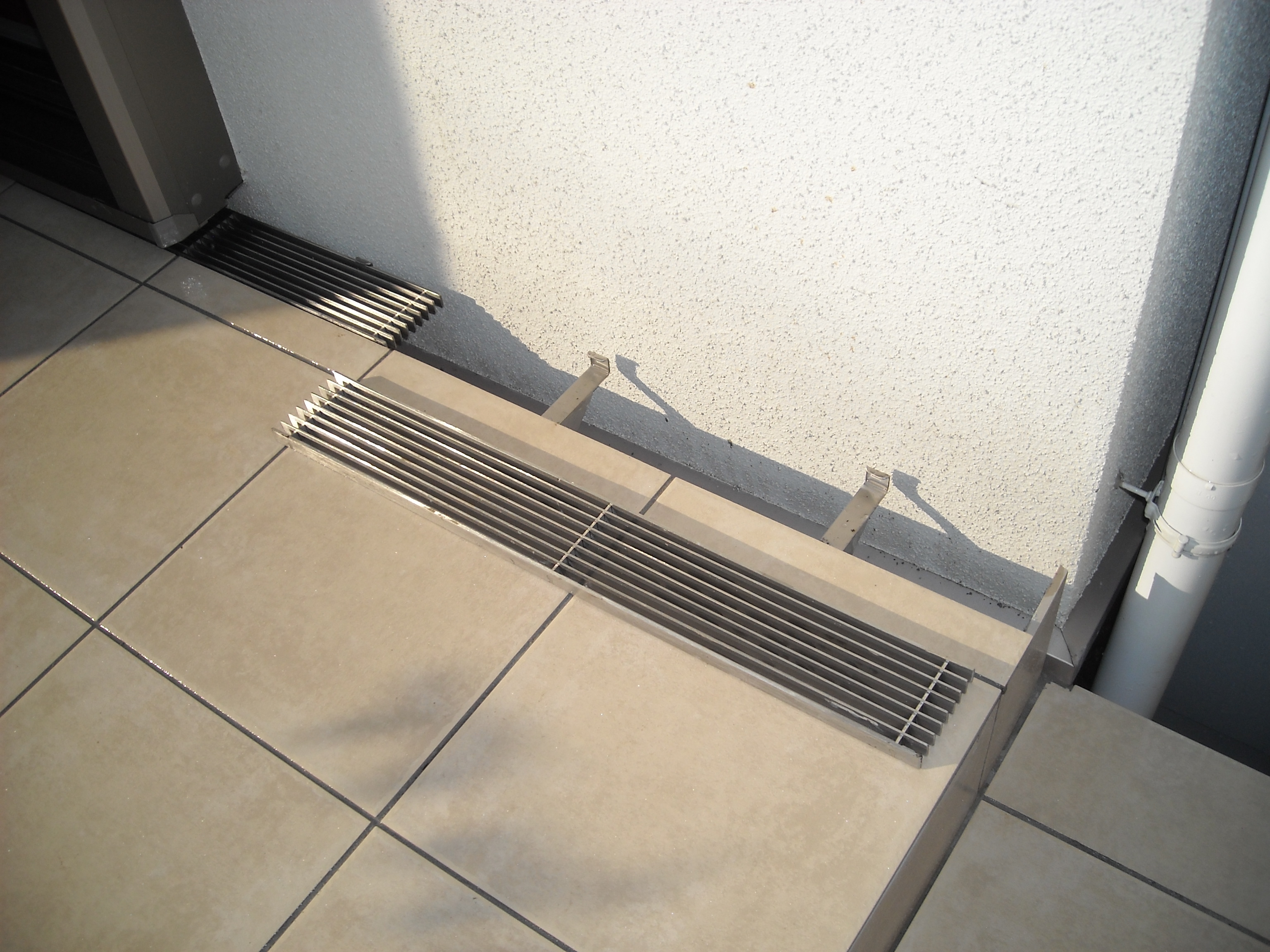 テラス構造物を建築基礎から離して施工、専用のグレーチングを使い隙間をカバーしてます。
