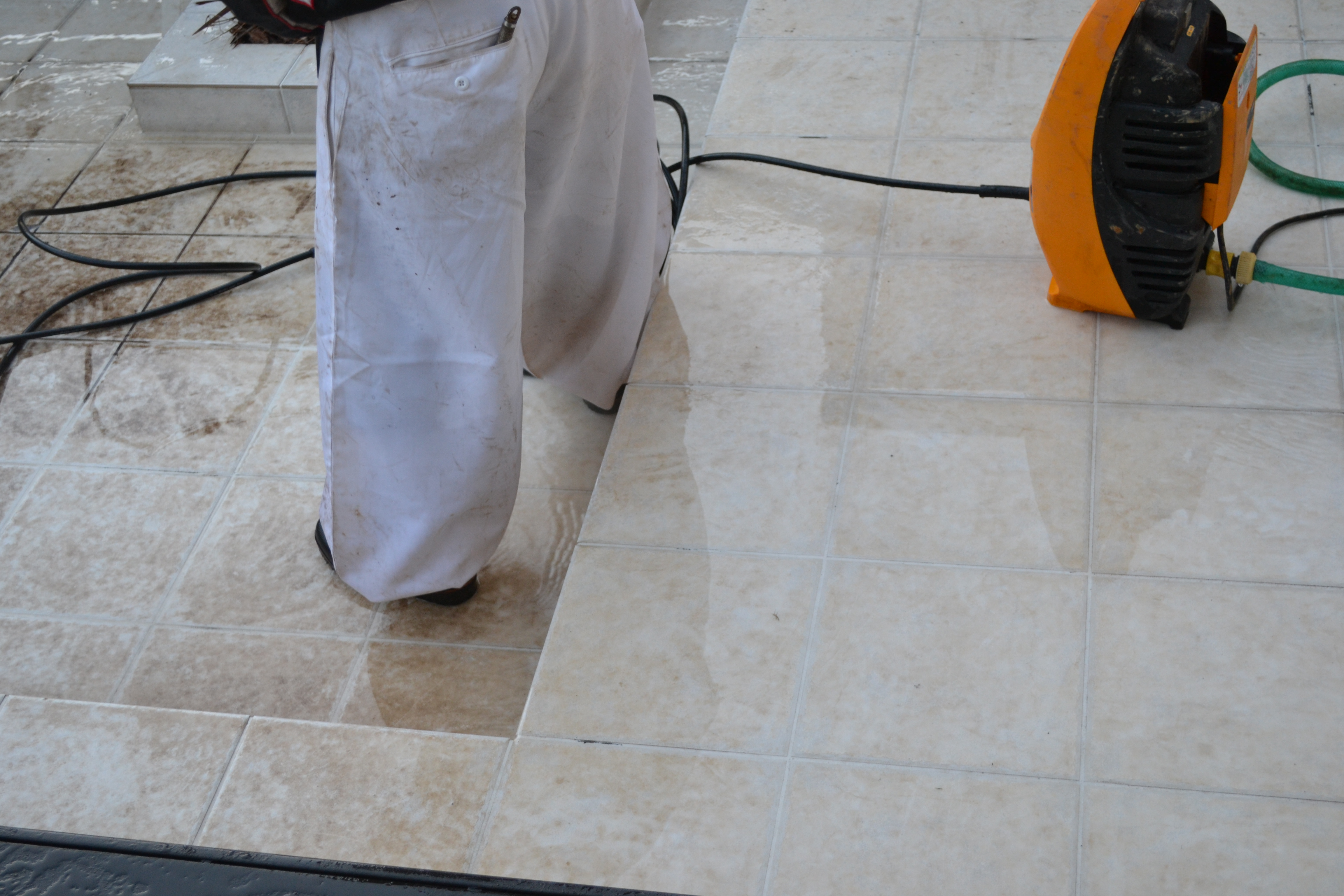 タイルを一枚一枚高圧洗浄すると、みるみる汚れが落ちるので結構楽しかったりします(笑)アレだけ汚れがこびりついてたのがウソのように綺麗になりました。