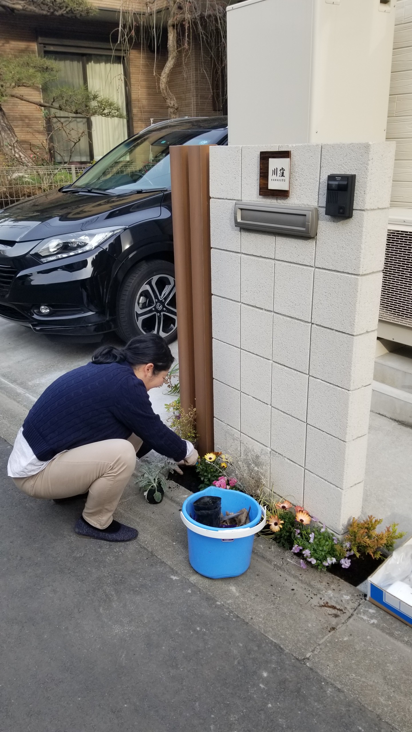 門周りには、弊社よりささやかなプレゼントの花を事務スタッフのお客様担当が頑張っています。