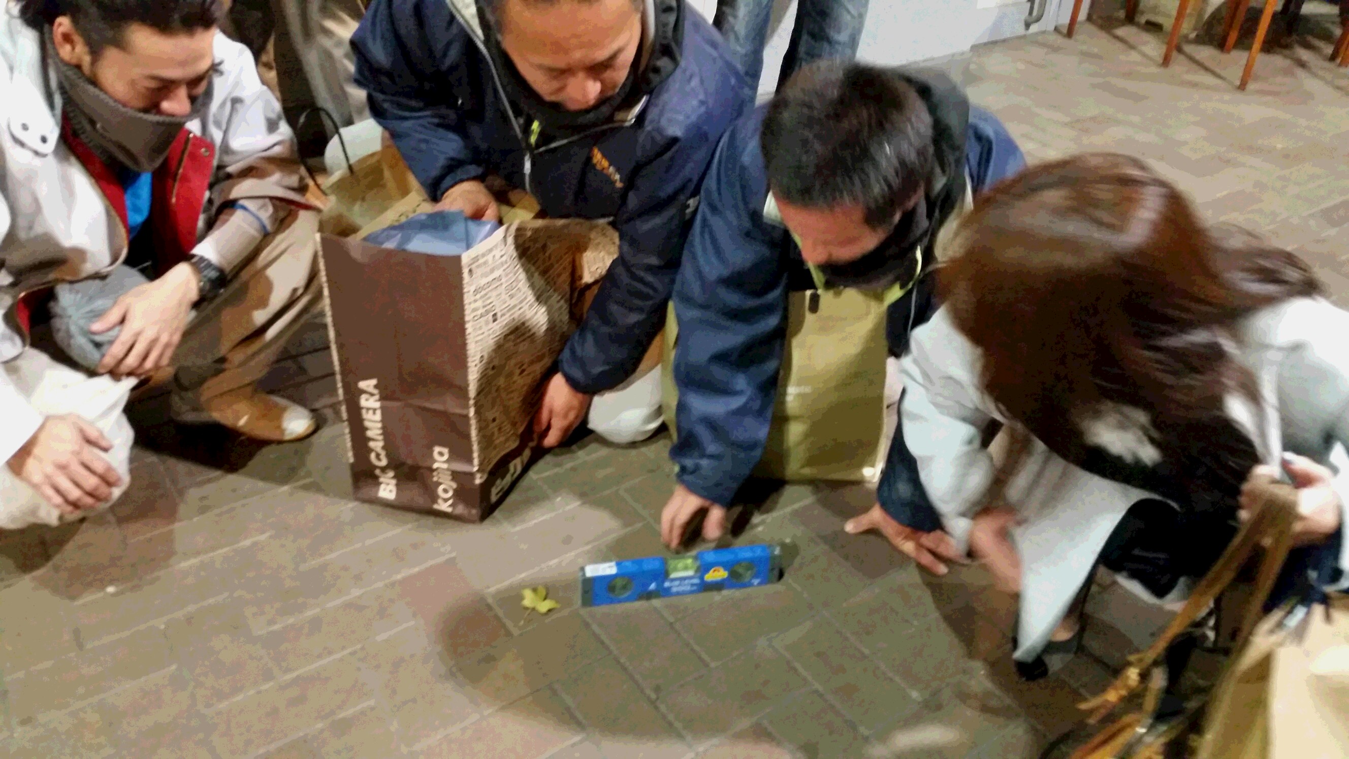仕事道具が当たり、歩道の勾配を図りだす職人まで・・・うん、2パーセントだな! って、おいおい(^^)