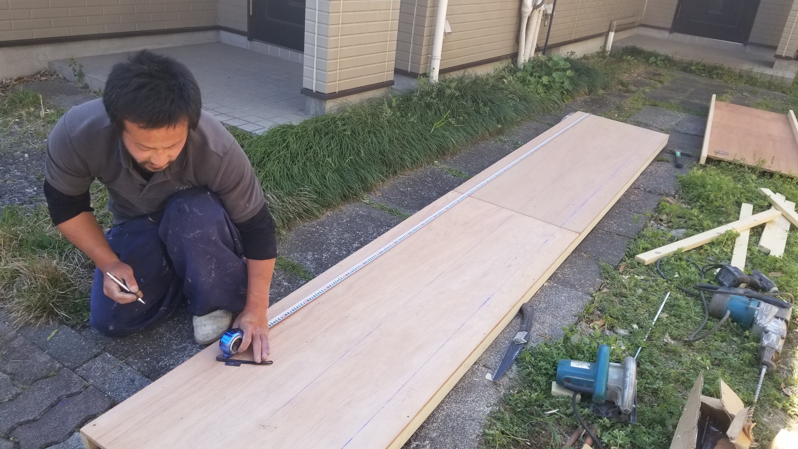 コンパネ(ベニヤ板)を電気ノコギリやハンマーを使い、大工さんに変身です(*^^*)