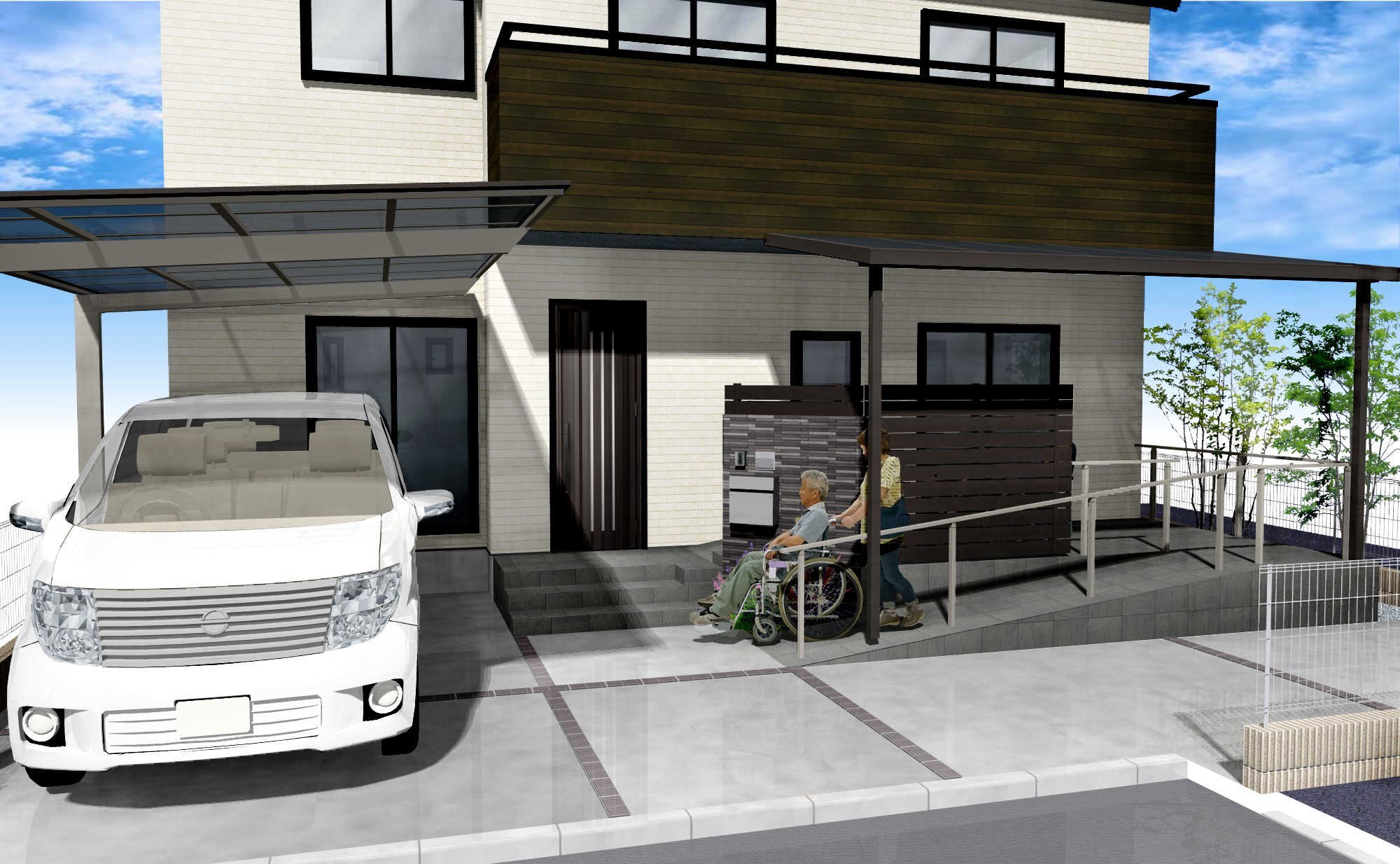 スロープまで屋根をかけ車いすなどの乗り降りにも便利にしました。