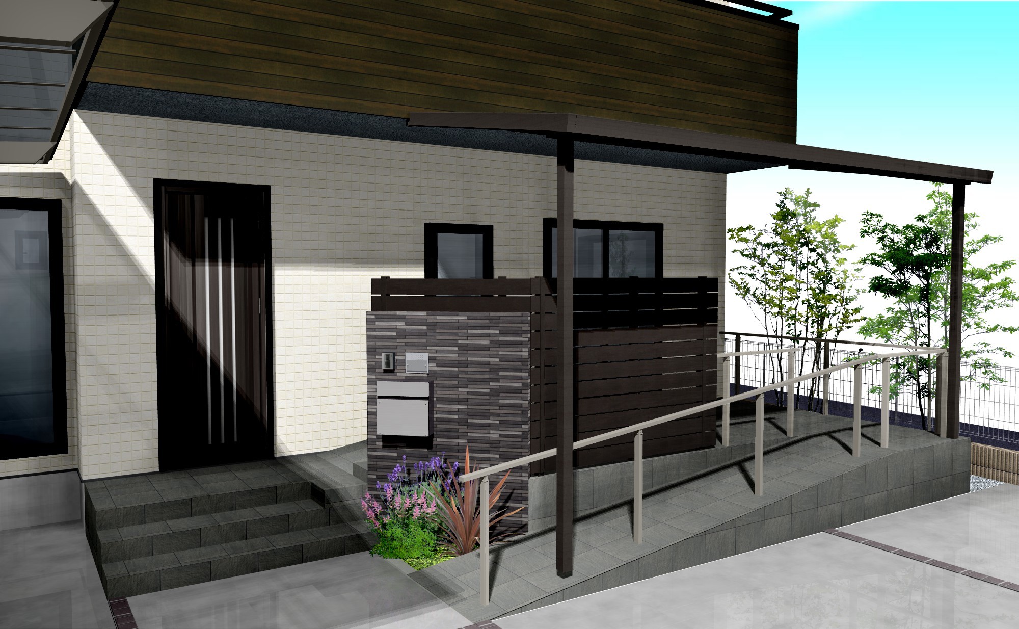 概要は、タイルテラスに目隠しをセットとしてスロープも造作、