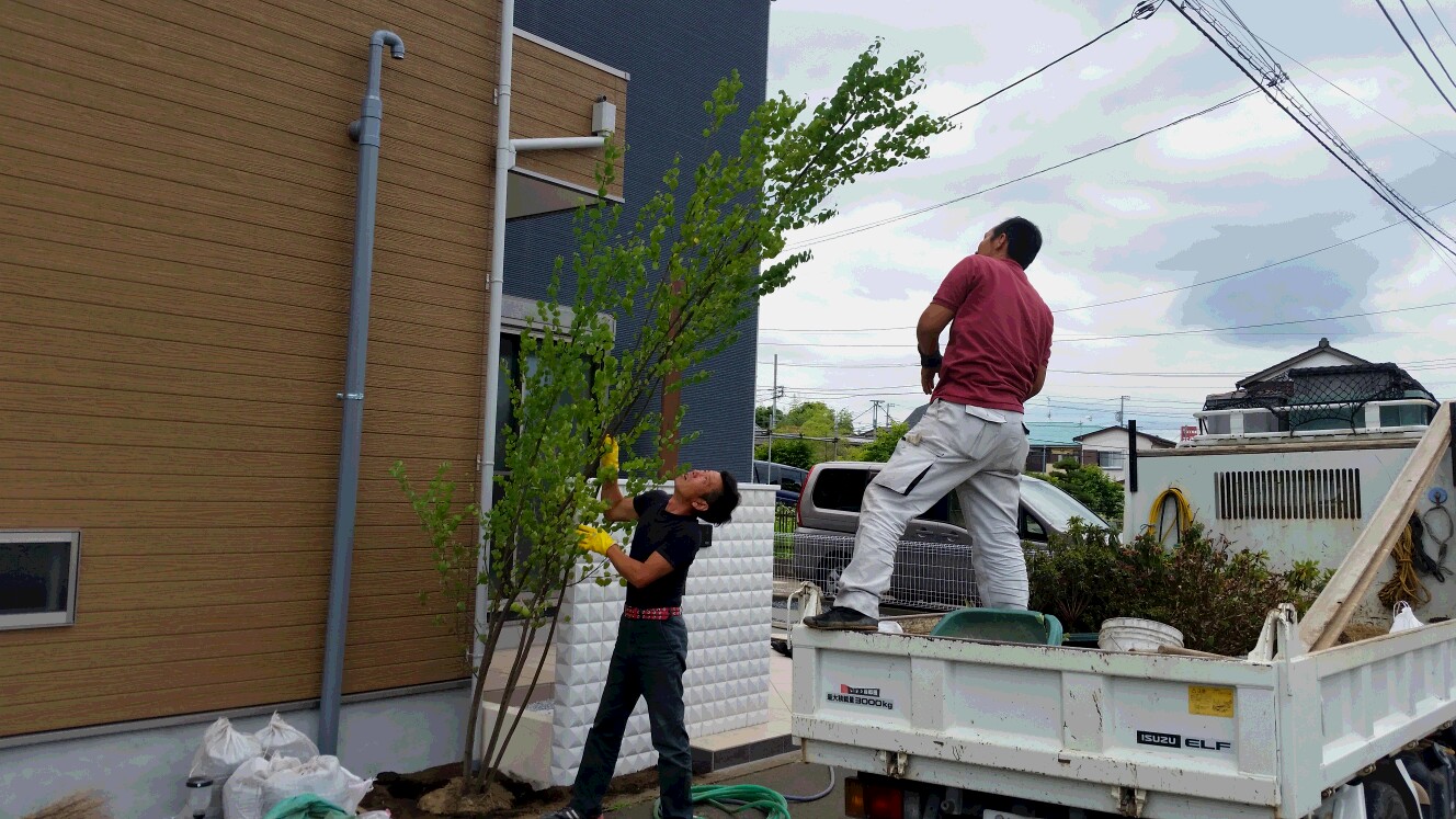 植木に詳しい鈴木が合流、綺麗に仕上がった外構に植物が入るコトで素晴らしい外構となります(^-^)