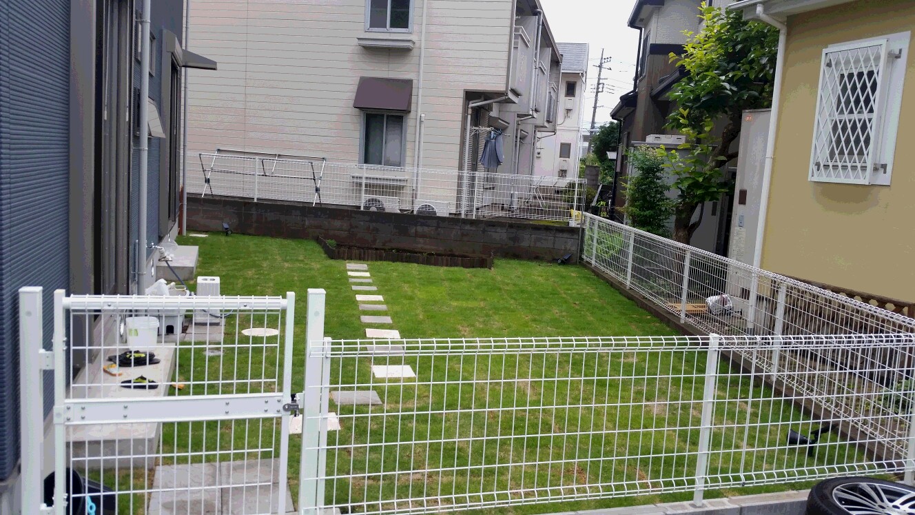 お庭部分は今回駐車スペースとの間にフェンスと門扉のみの施工です。