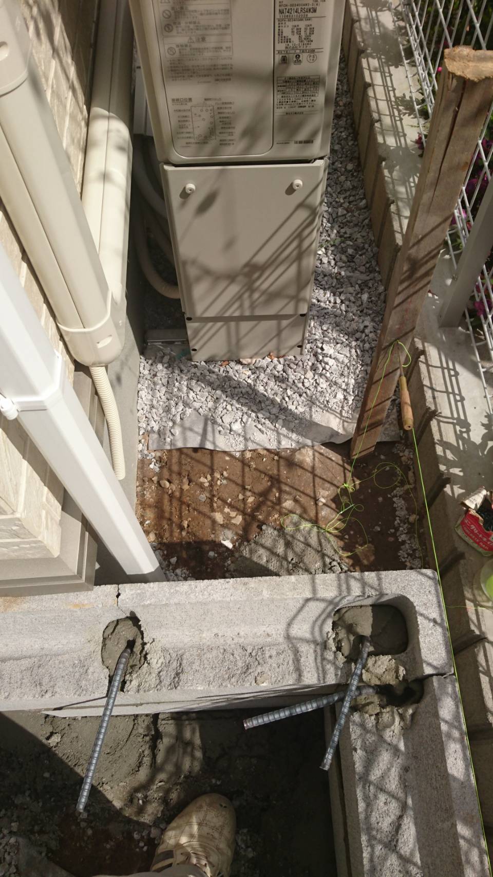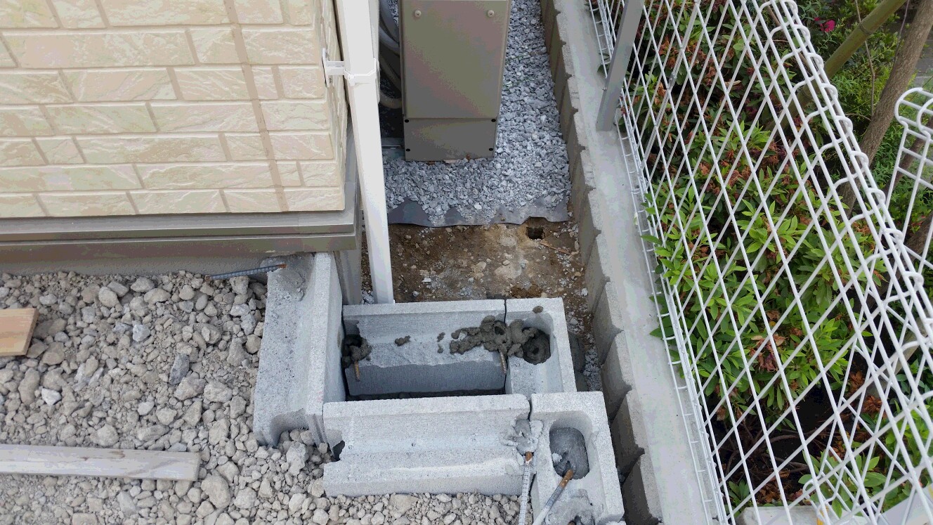 木製フェンスを撤去した場所にコンクリートブロックの増し積みと鋳物のフェンスを取り付けます。
