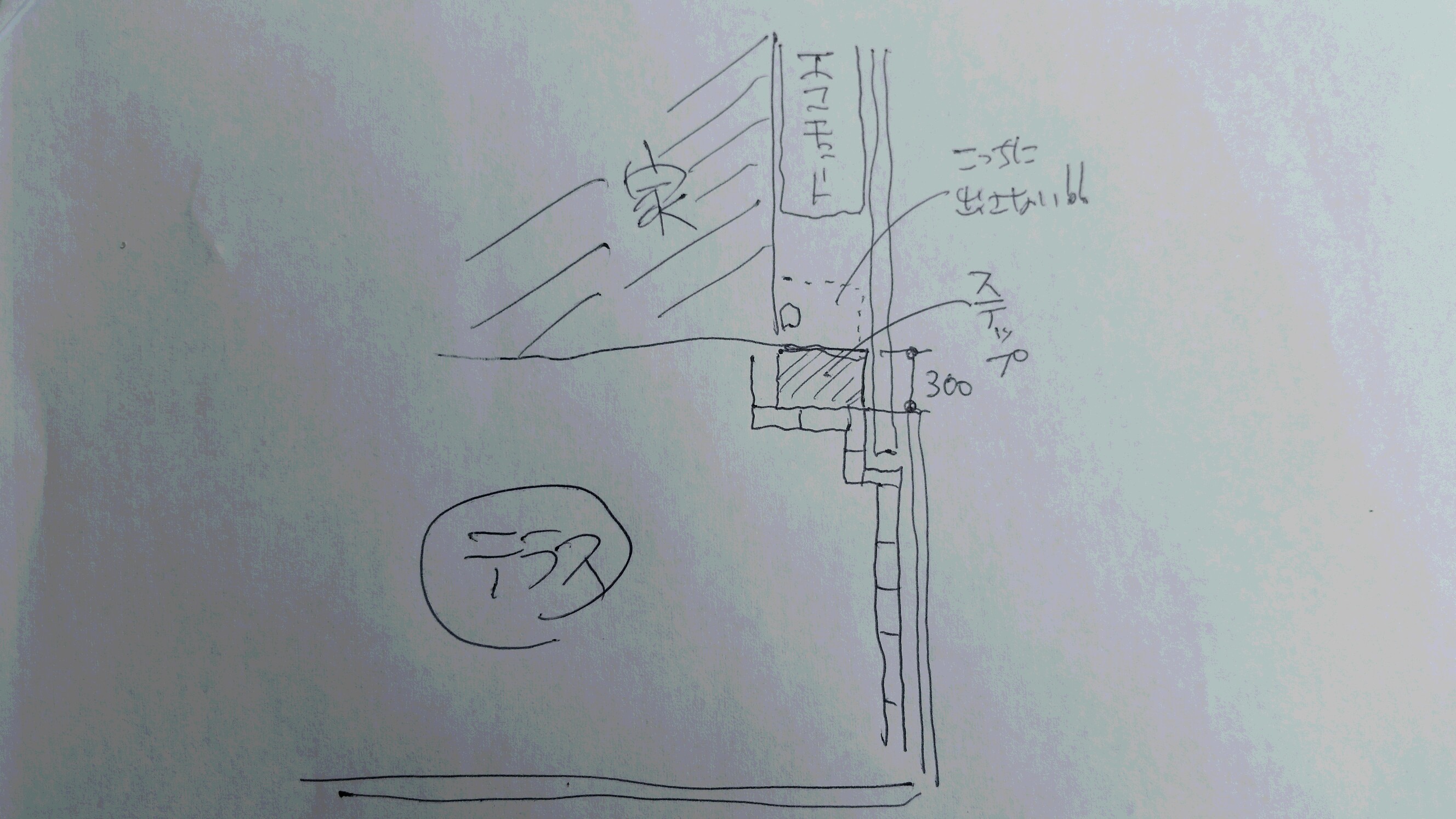 私 「もしもし、今作ってる家の裏側のステップ、テラス内にへこますように変更になった!」