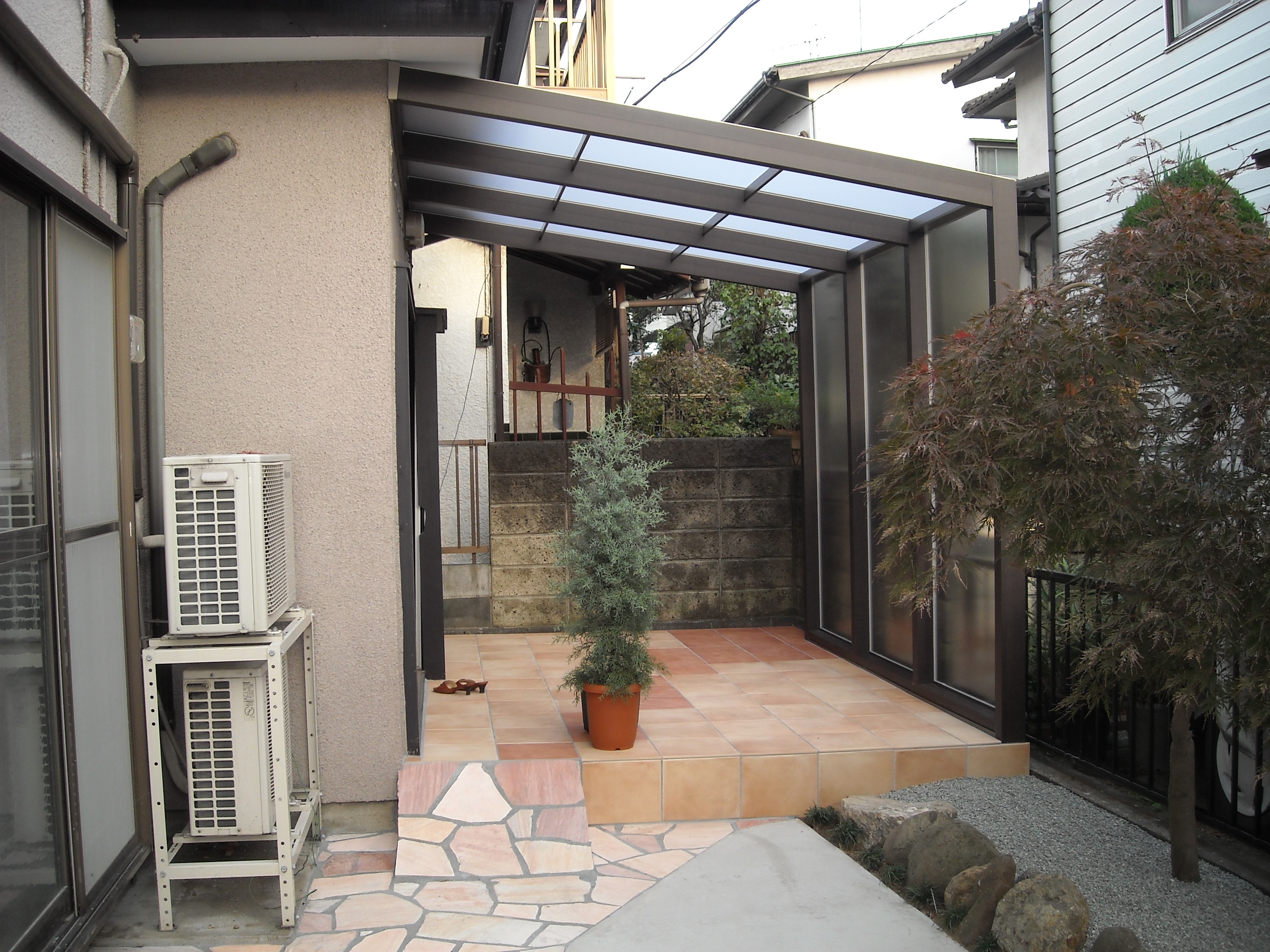 腰壁の付いたお洒落な屋根を組み合わせたタイルテラス!