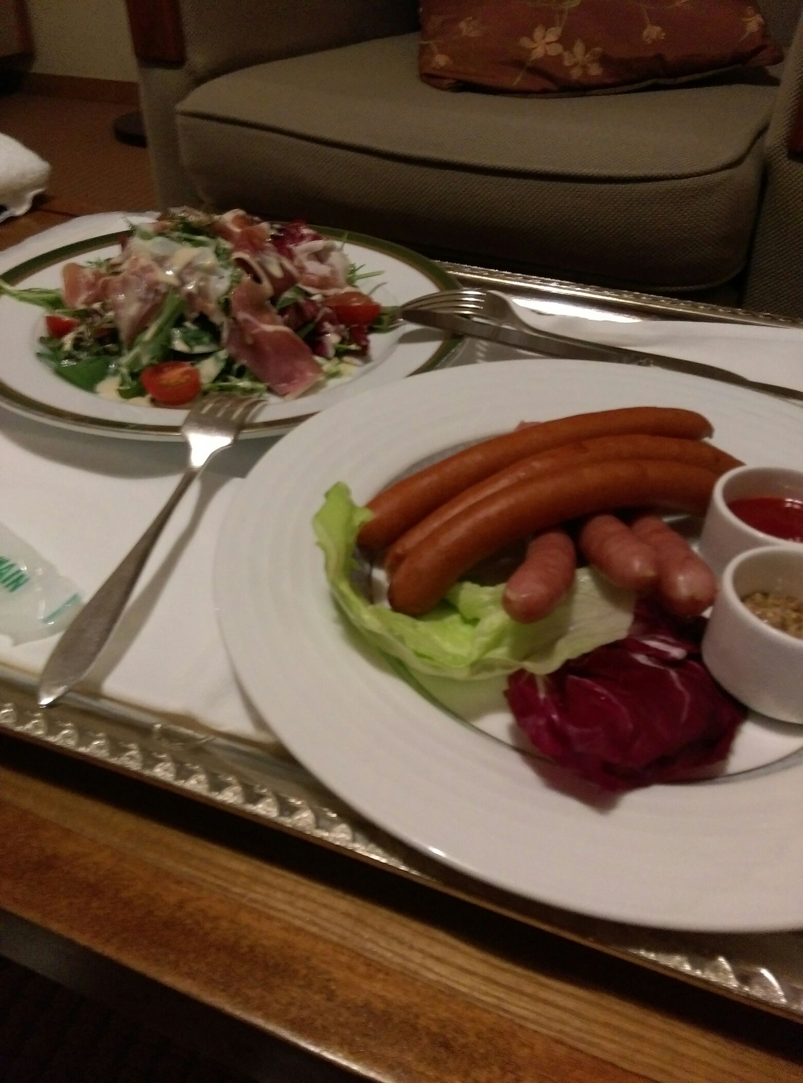 チェックインを終えると、富士屋ホテルの歴史を説明してくれながら、お部屋まで案内してくれました。早速お風呂に入り、乾杯をしていると、こんな時じゃないとルームサービスなんて頼む機会がないからと、夫がいくつか注文してくれました(*^_^*)