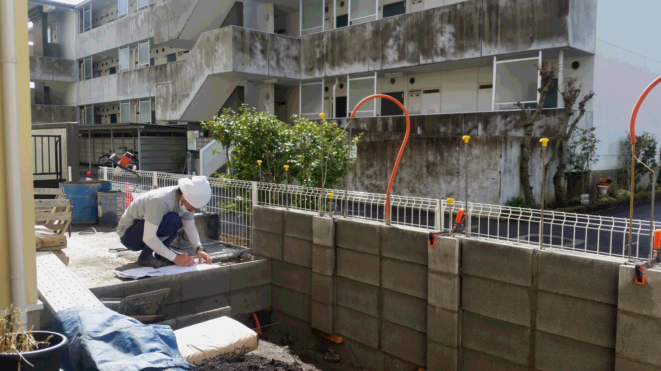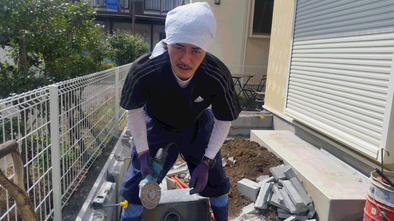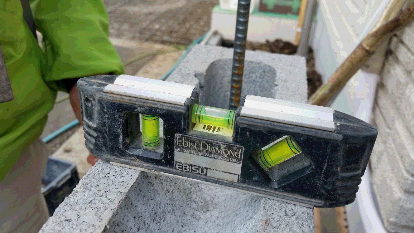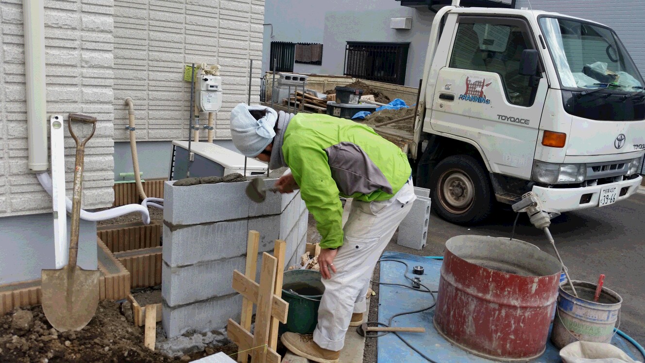 一本一本丁寧にブロックを積み上げるのは弊社一番の若手の宏樹、ブロックコテを使って器用に作業を進めます。