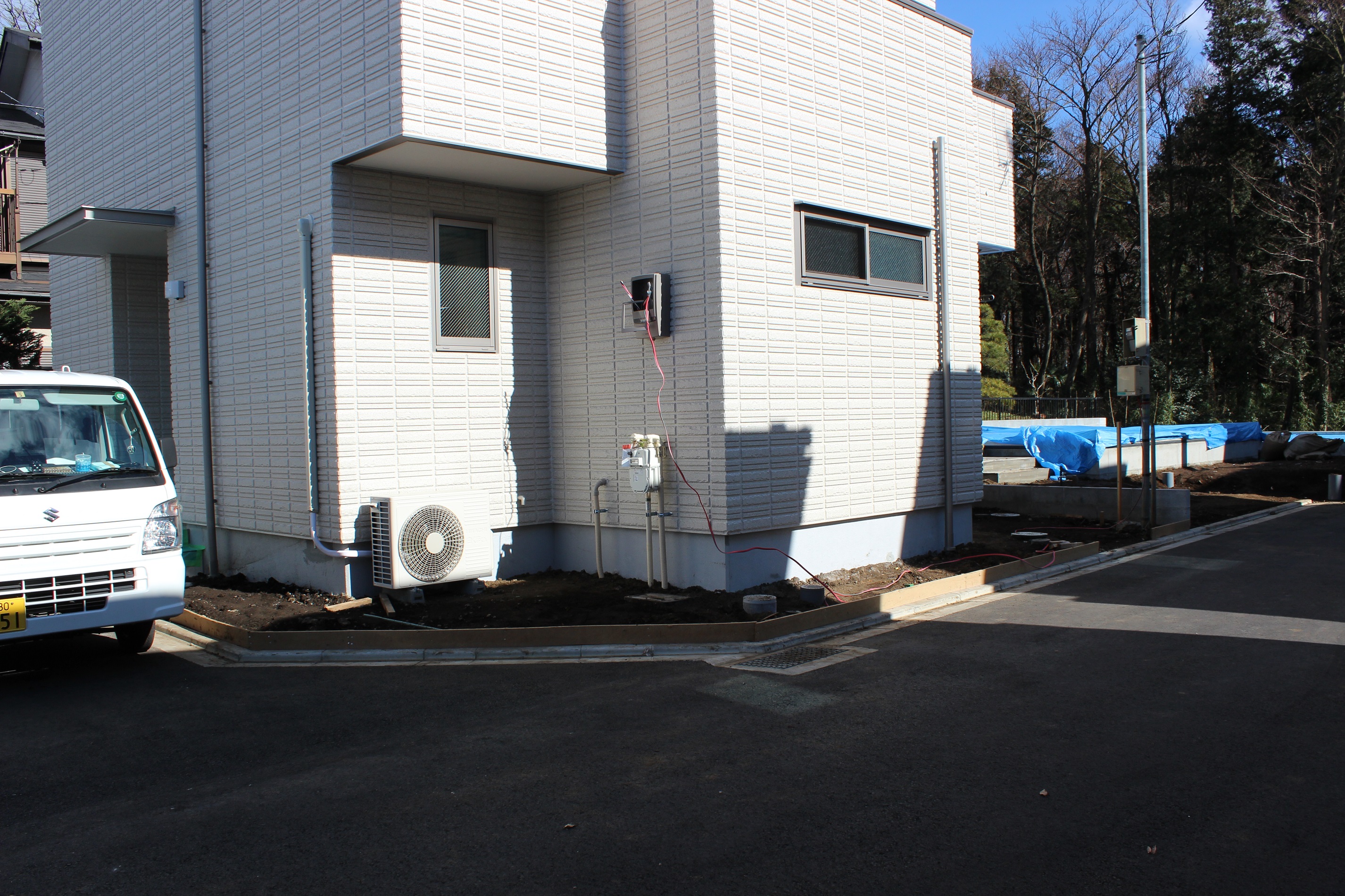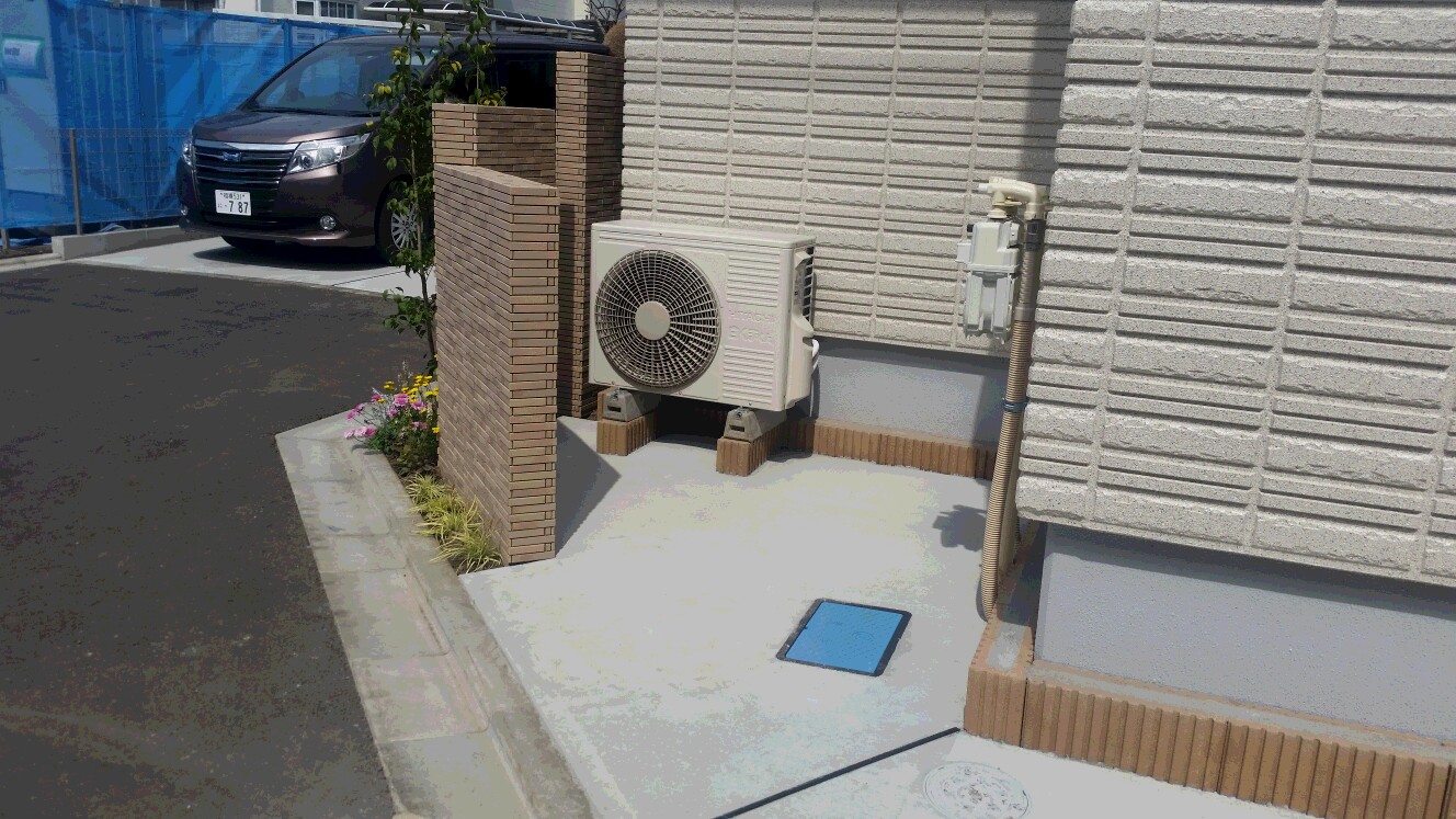 門袖の後ろのは駐輪スペース、勾配があるのでクーラー室外機が水平に設置できる様にしました。