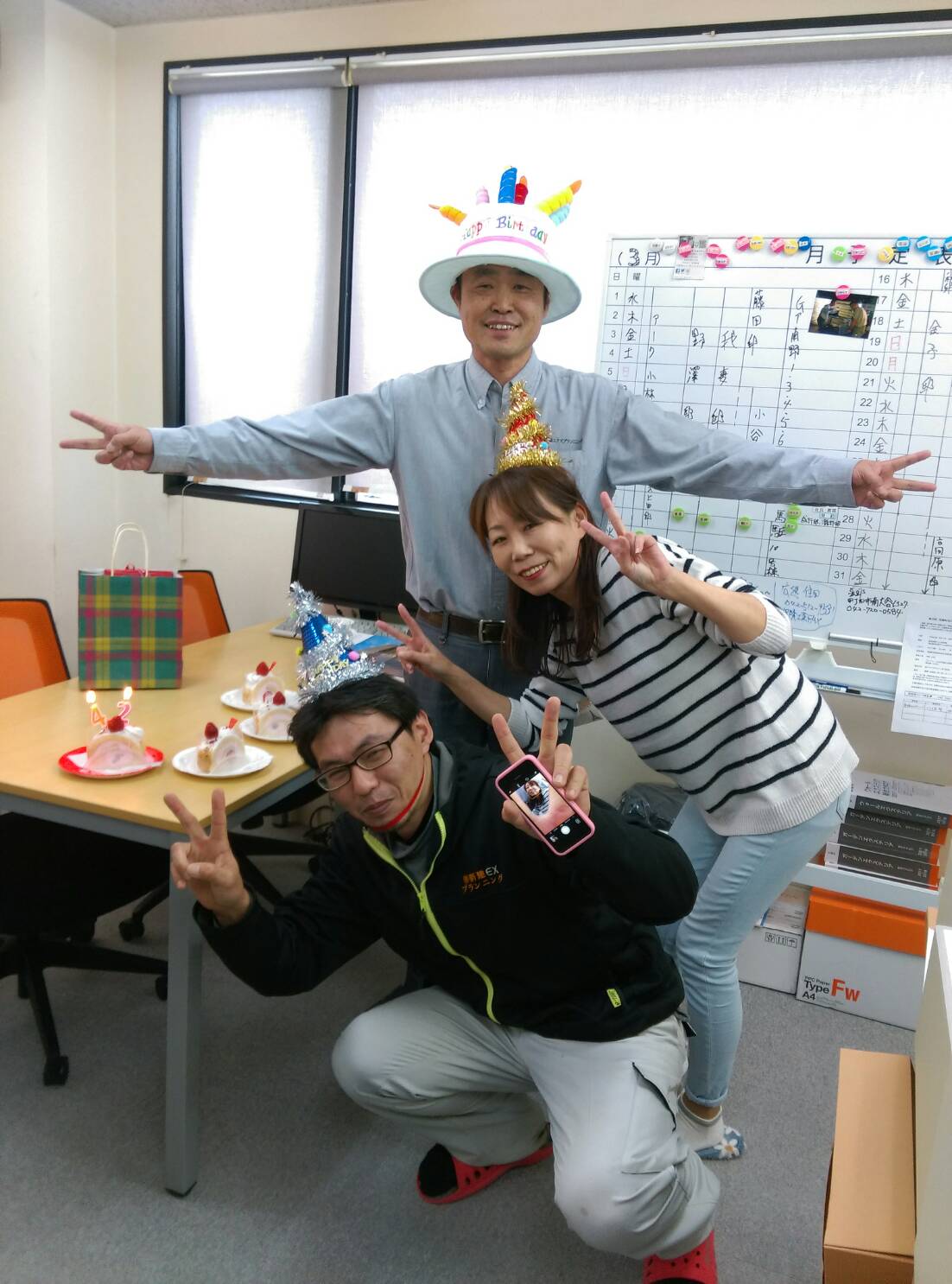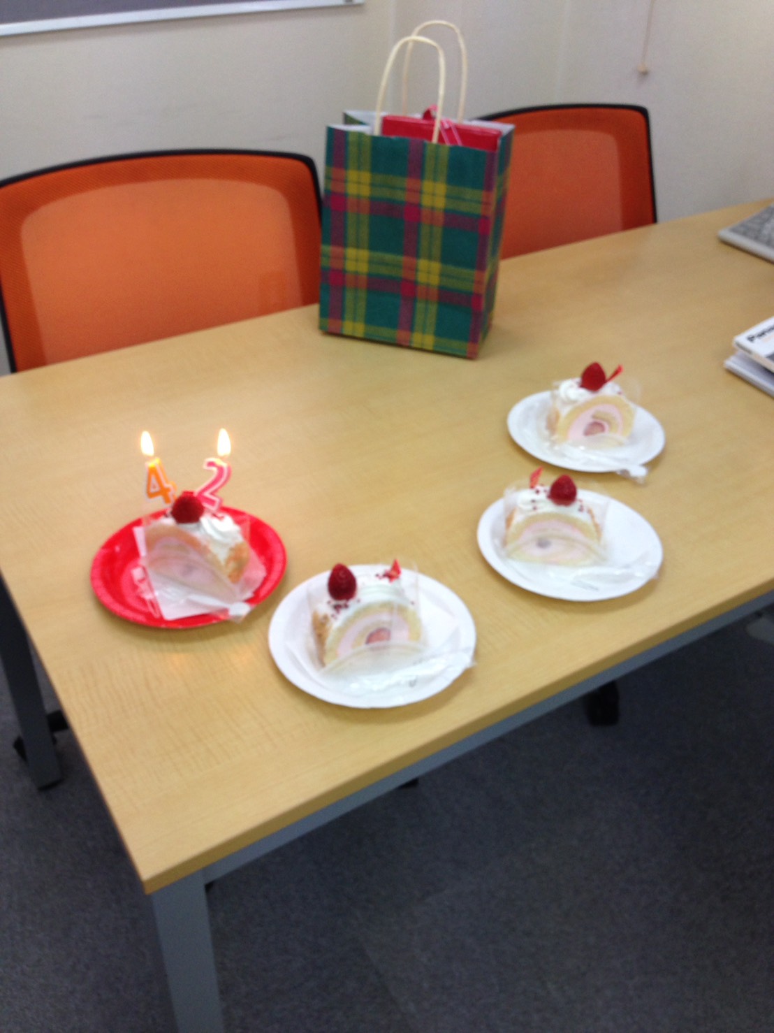 びっくりしてオロオロしていると帽子をかぶった事務所のみんながケーキとプレゼントを持って登場!
