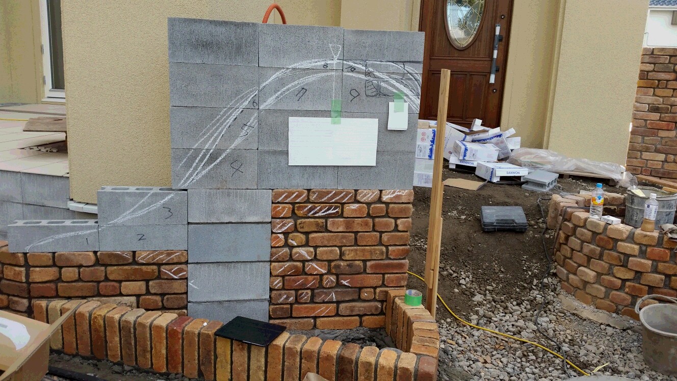 ある程度の高さまで組積したら、ポストや表札の位置確認、全体のバランスを確認してRになる天端のイメージをチョークで下書き