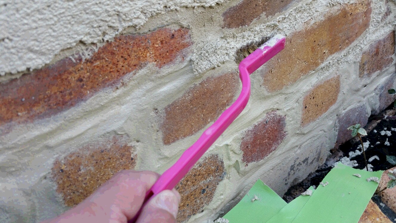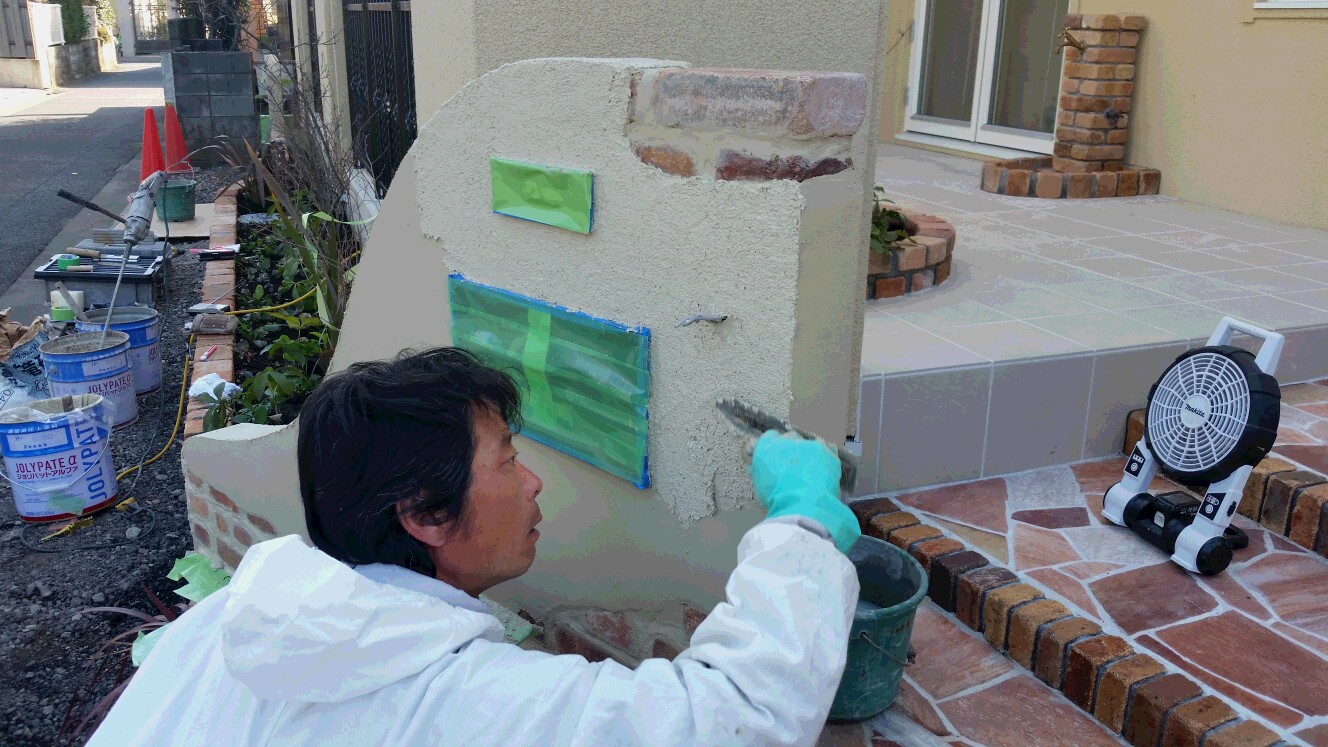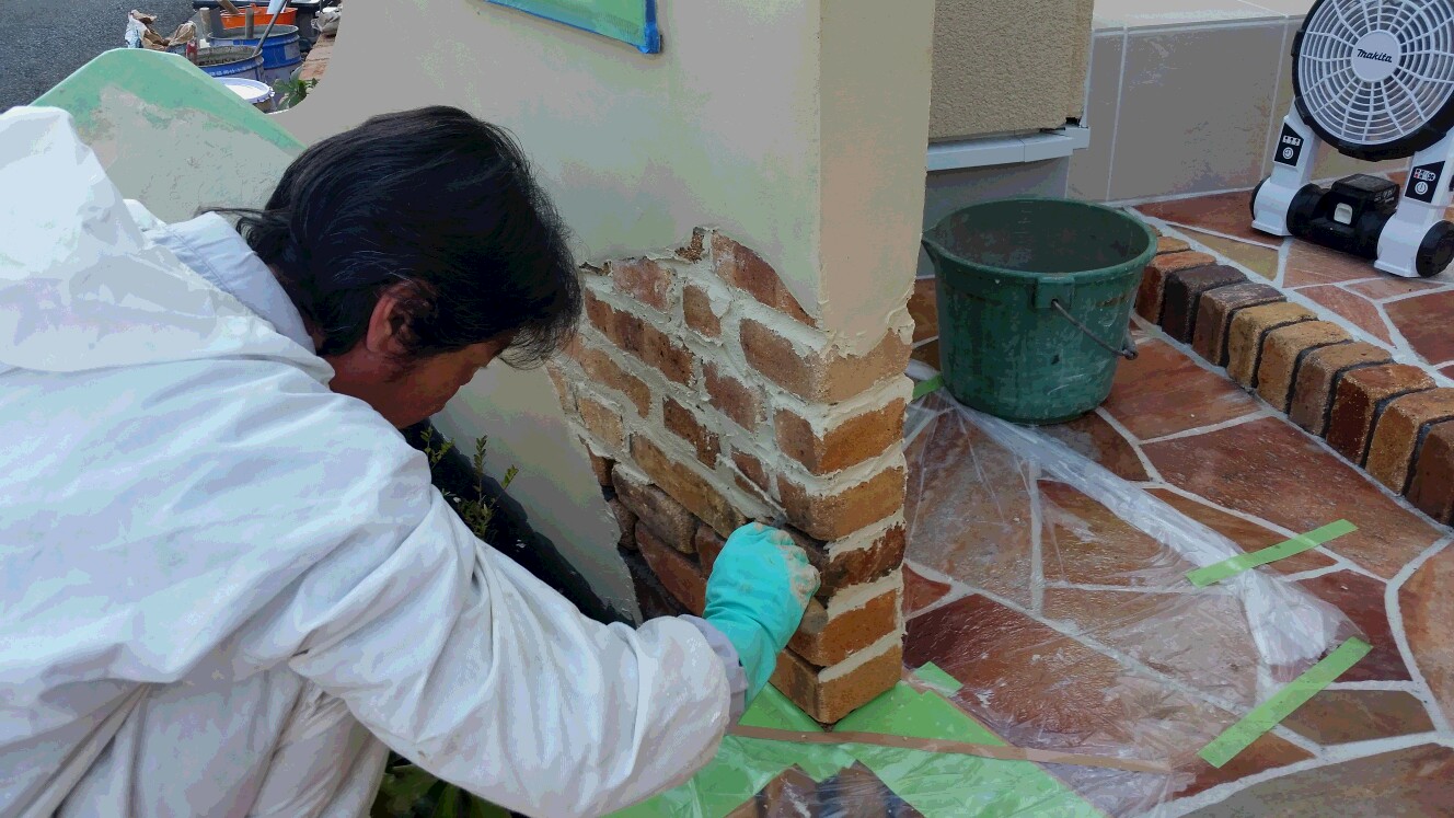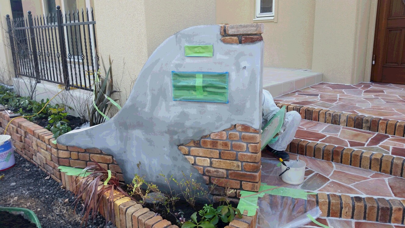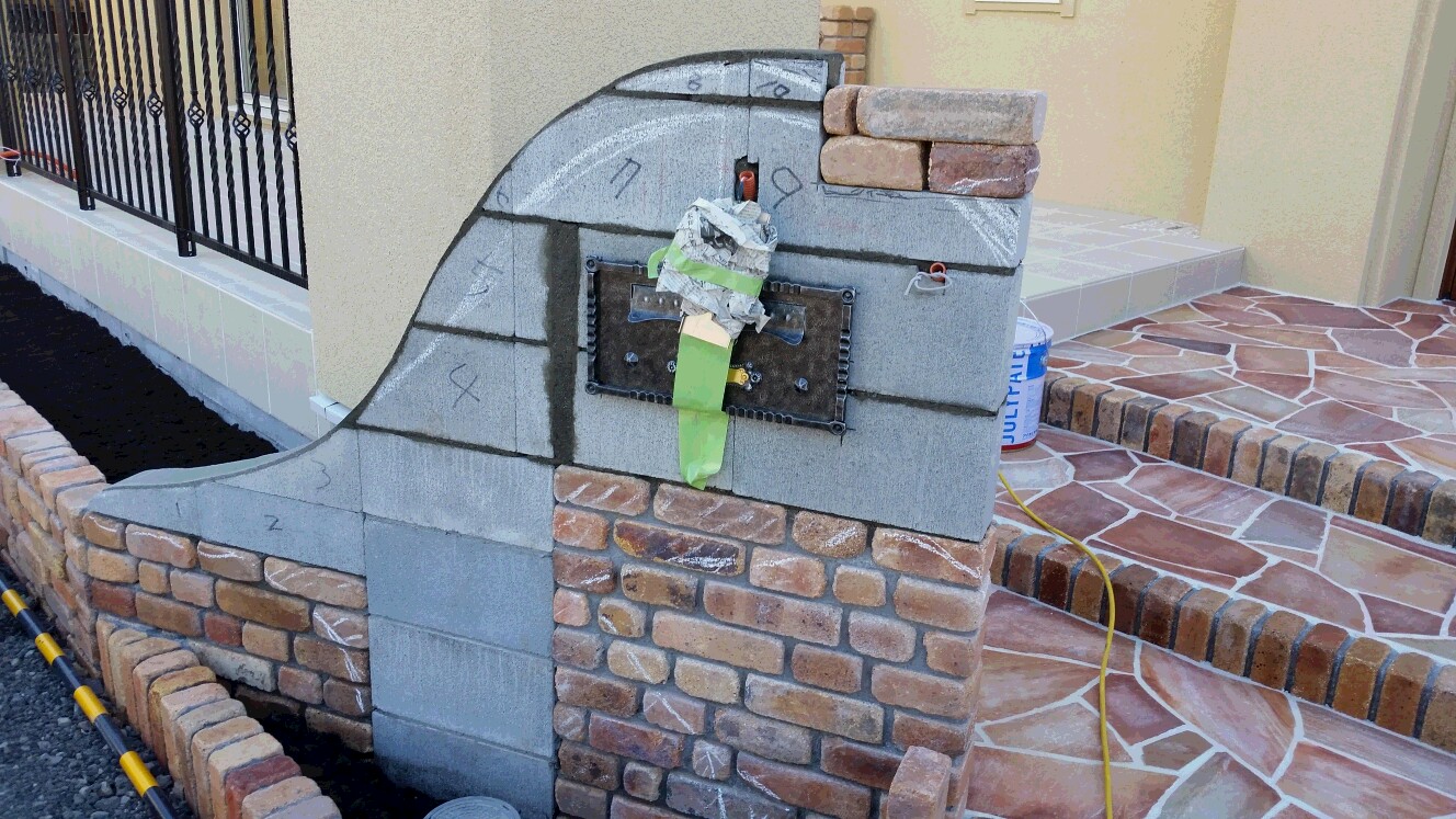 今回施工の門袖は、中世の洋館などで見られる石積み(レンガ)の建物に粘土セメントの様な(詳しくは知りませんが・・_(._.)_)表面を塗り固めた一部の塗り材が剥がれたような・・・