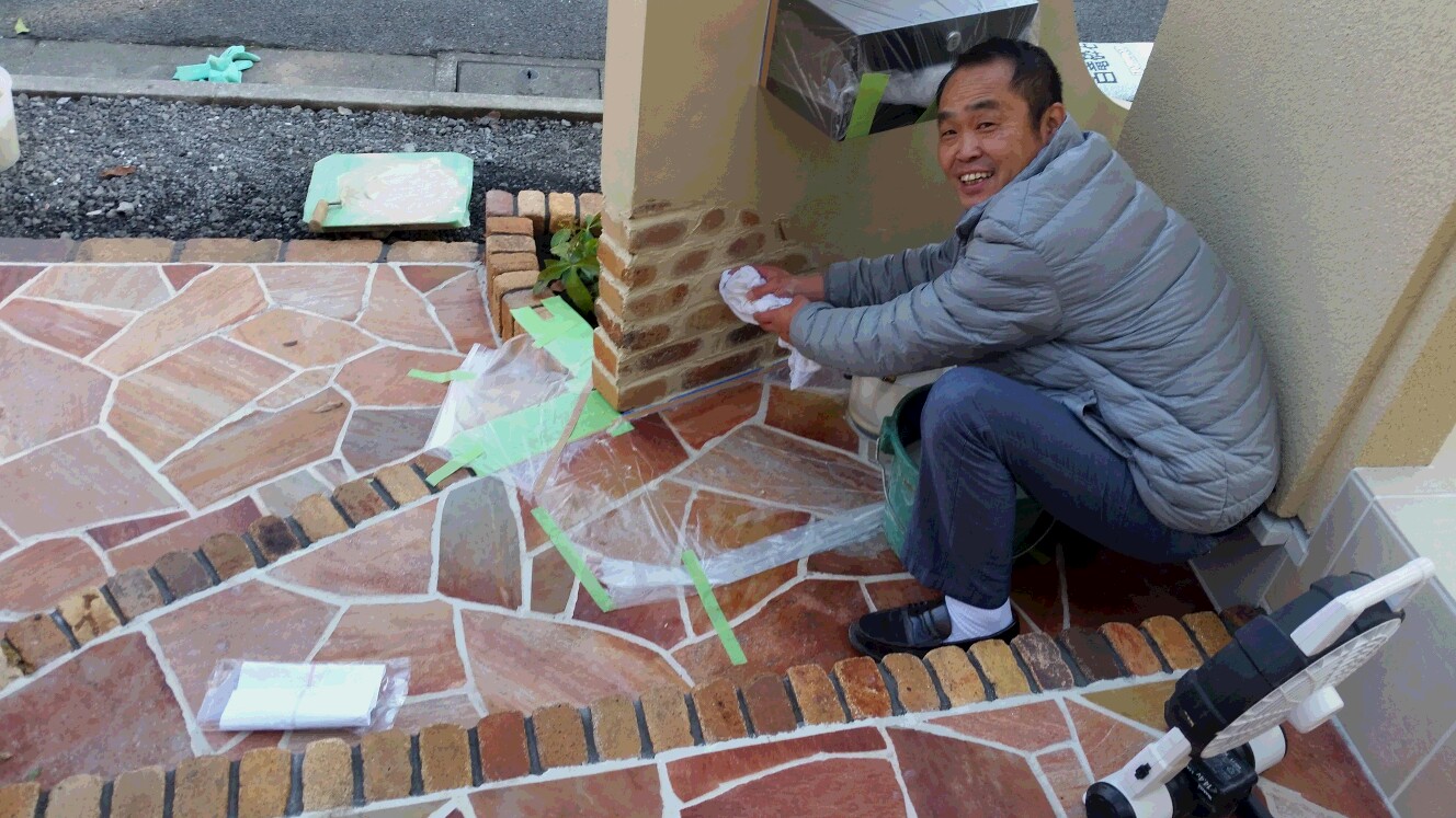 門袖の仕上げは塗装材に骨材を混ぜ、鏝(コテ)を使いジャリジャリとこすり付けるように仕上げて行きます。