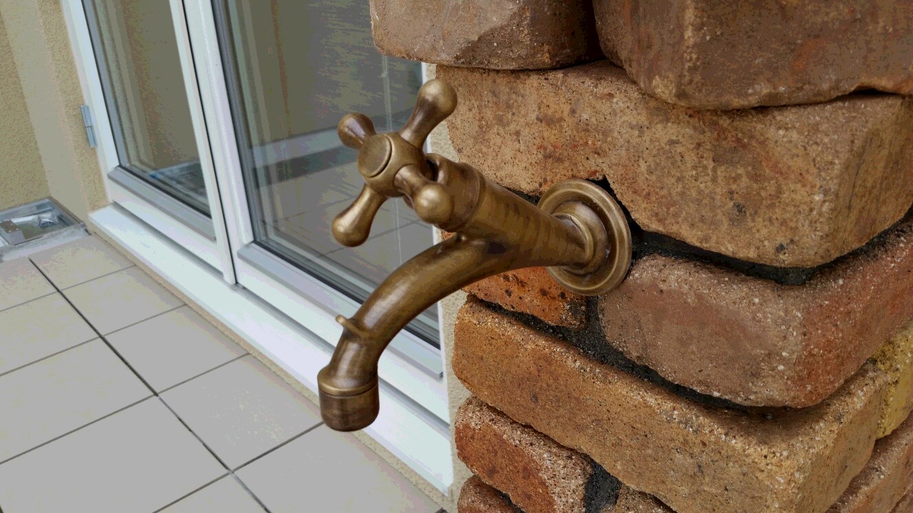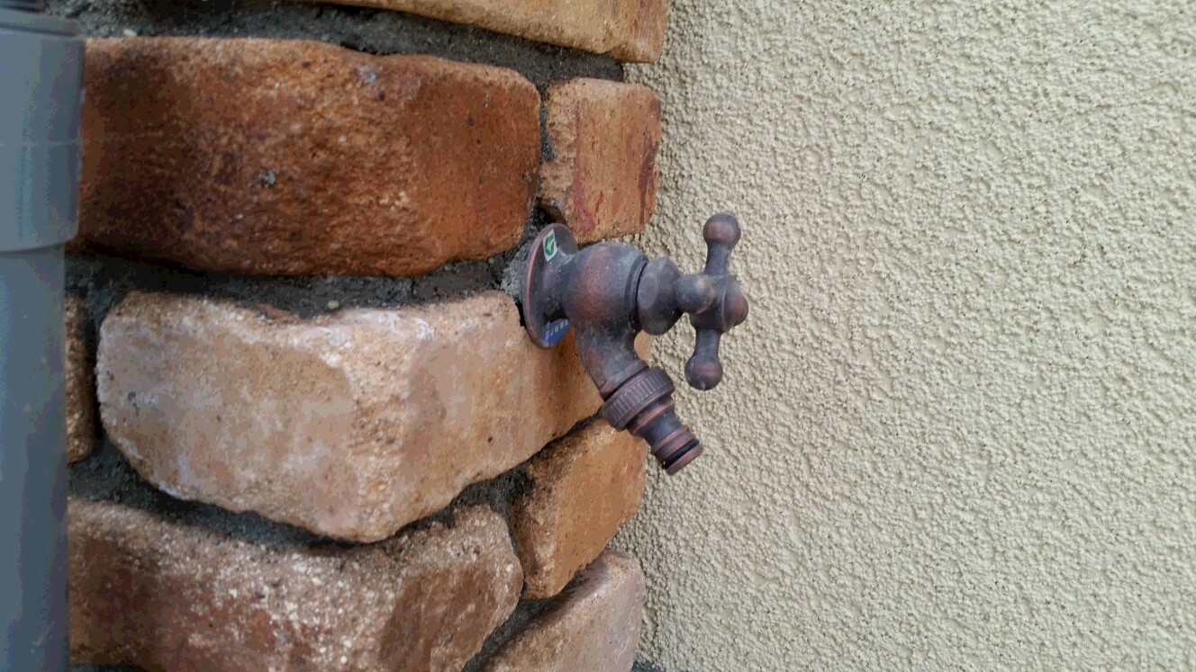 タイルテラスも完成、テラスに作られたアンティークレンガを使ったオリジナル立水栓!蛇口もこだわってます。
