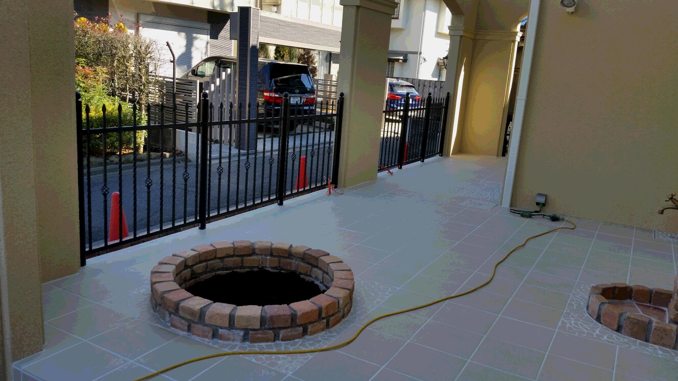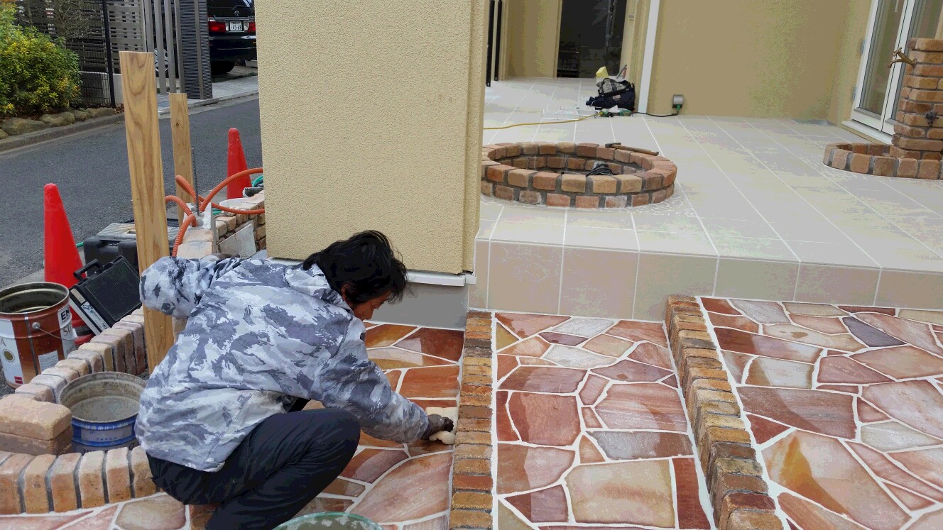 花壇のレンガ部分やオリジナル立水栓の周りはタイルを細かく割りました、こうすることで四角いタイルと丸く施された花壇レンガとの交わる部分の相性を柔らかく見えるようにしました。