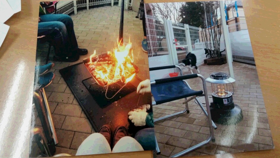 写真も添えられていて、見ると寒空の中火を焚きながらご家族とワンコがお庭を楽しんでいるでいます。(^^)