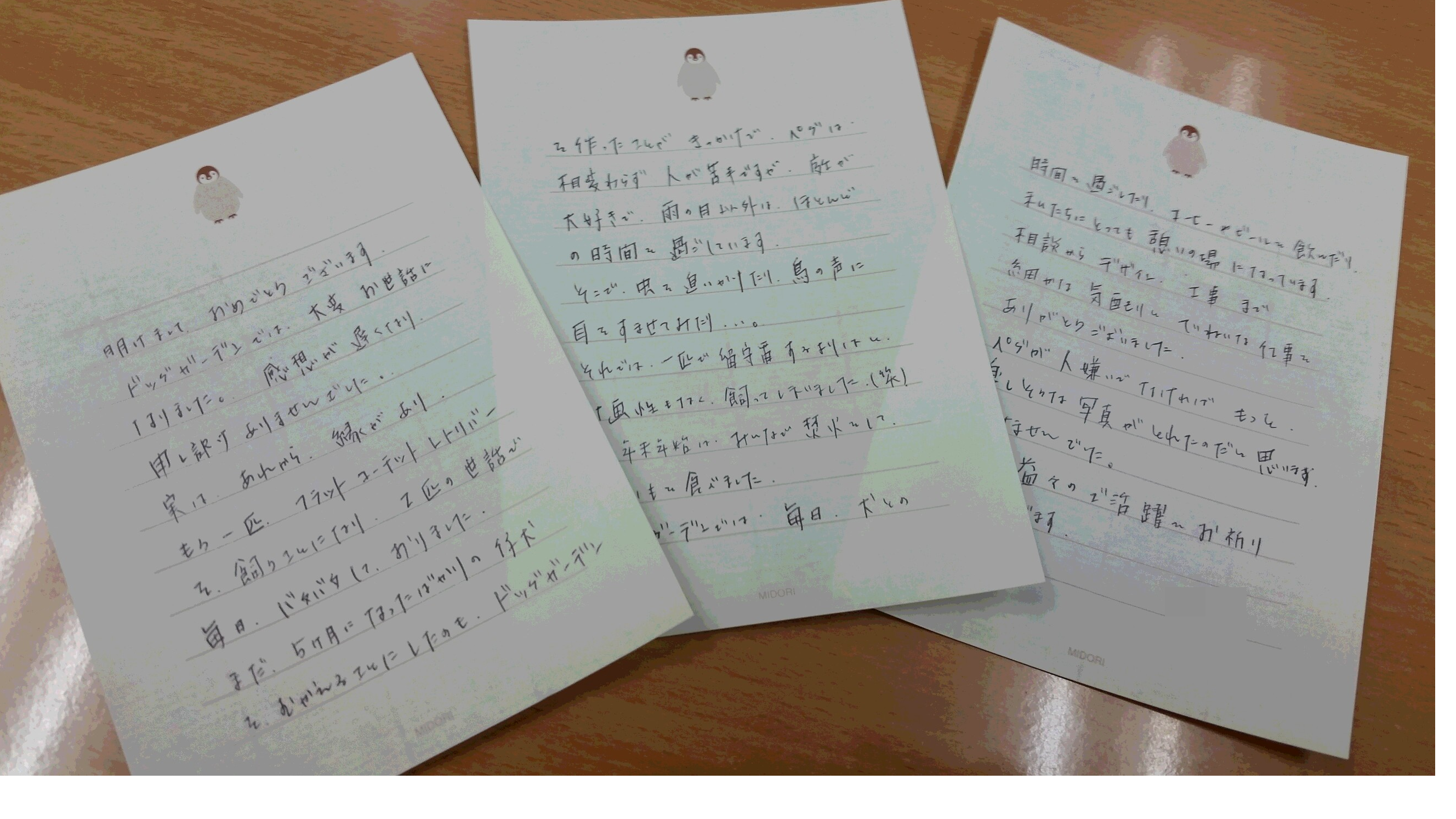 昨年に施工しました「ワンコと過ごせるお庭にしたい」というご相談を頂き、お庭をフェンスで囲い床の舗装とテラスの屋根に目隠しフェンスを取り付けたリガーデンを提案させて頂いたお客様より、お手紙が届きました。