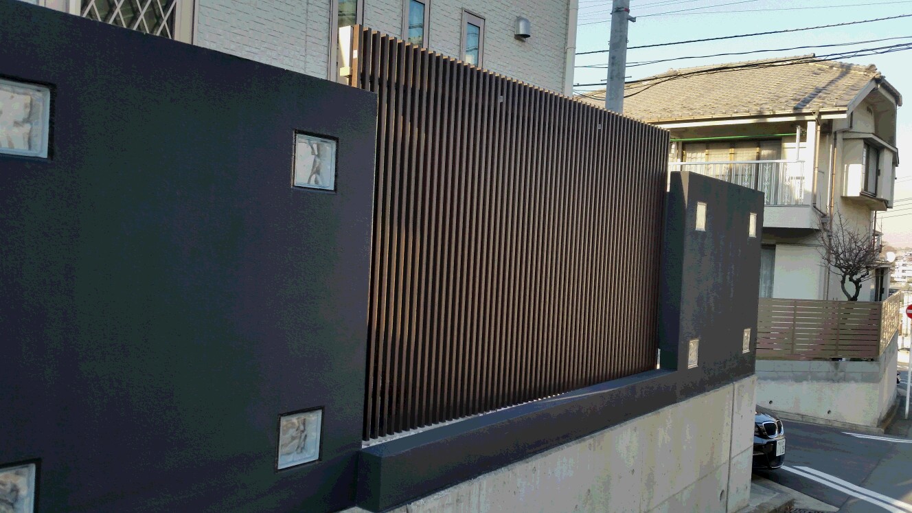 家はホワイト系の外壁にアクセントの木目調縦格子のスリットをが格好の良い建築、外構のフェンスも同じ色調のアーチやポールそして門扉の色も合わせ門袖の中央部分には同じ木目調の縦格子スリットをアクセントで配置してます。