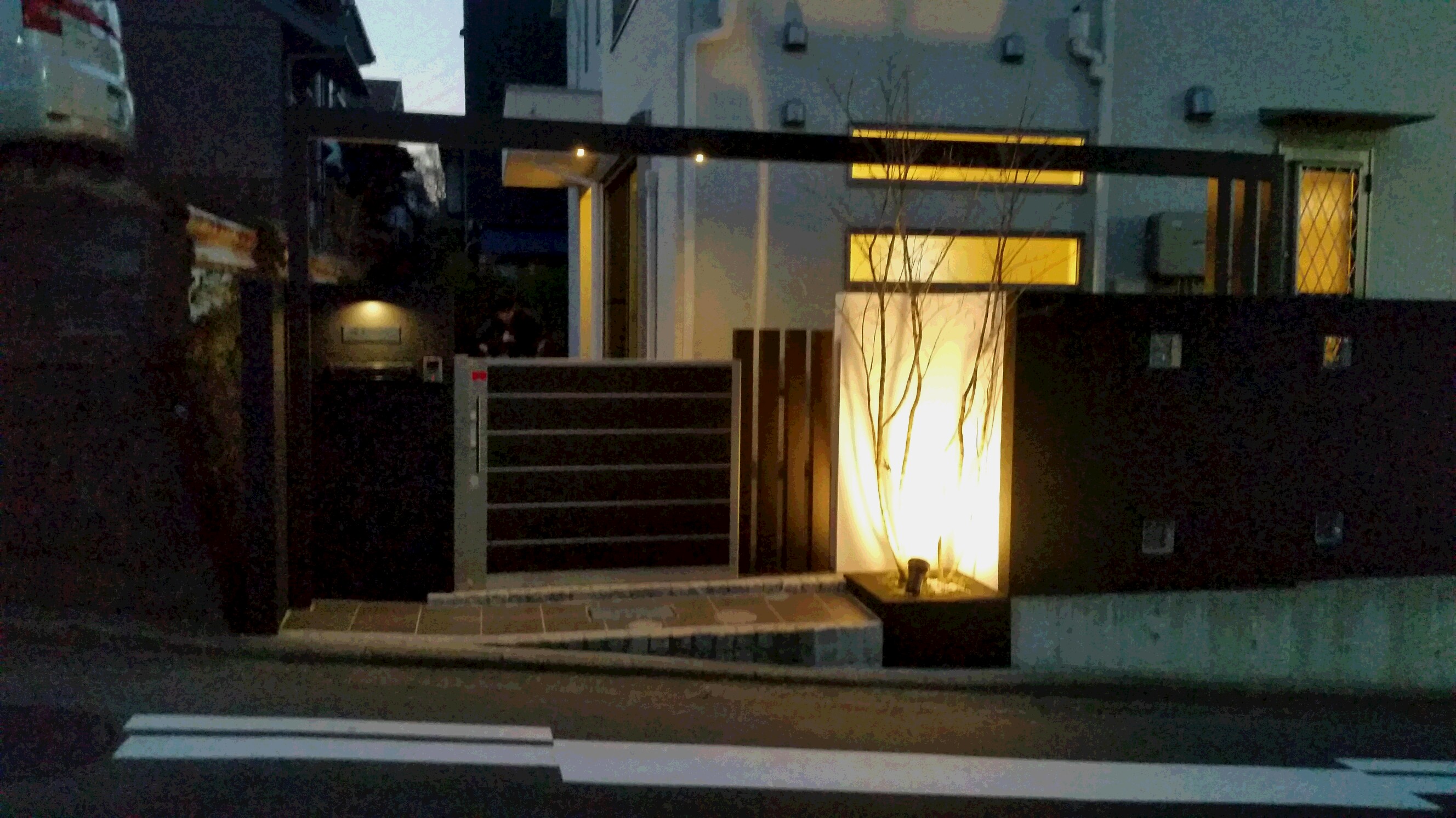 植栽スペースには、ソヨゴを植えスポットライトでお洒落に演出しました・・この時期は葉が無くてさみしいけど(^^)