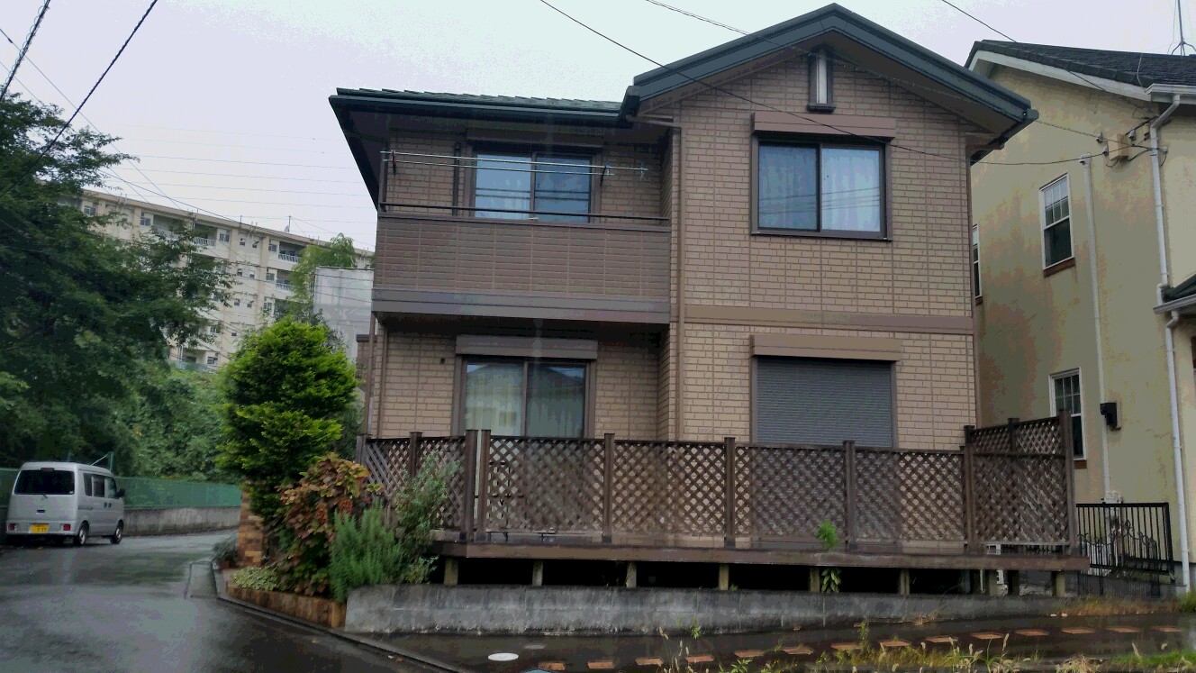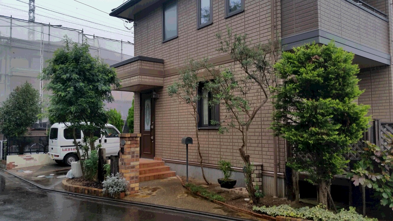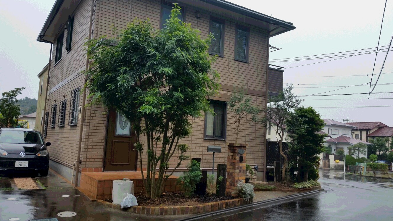 15年ほど前に新築を建て一緒に工事した外構は、レンガの門柱をメインにアプローチと植栽が施されているオープン外構、お庭部分は全て自然木のウッドデッキが施されていて使い勝手も良さそうです。