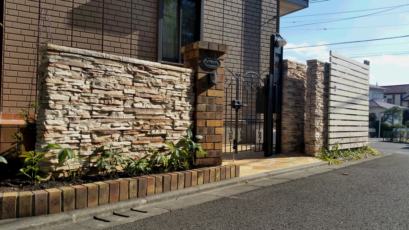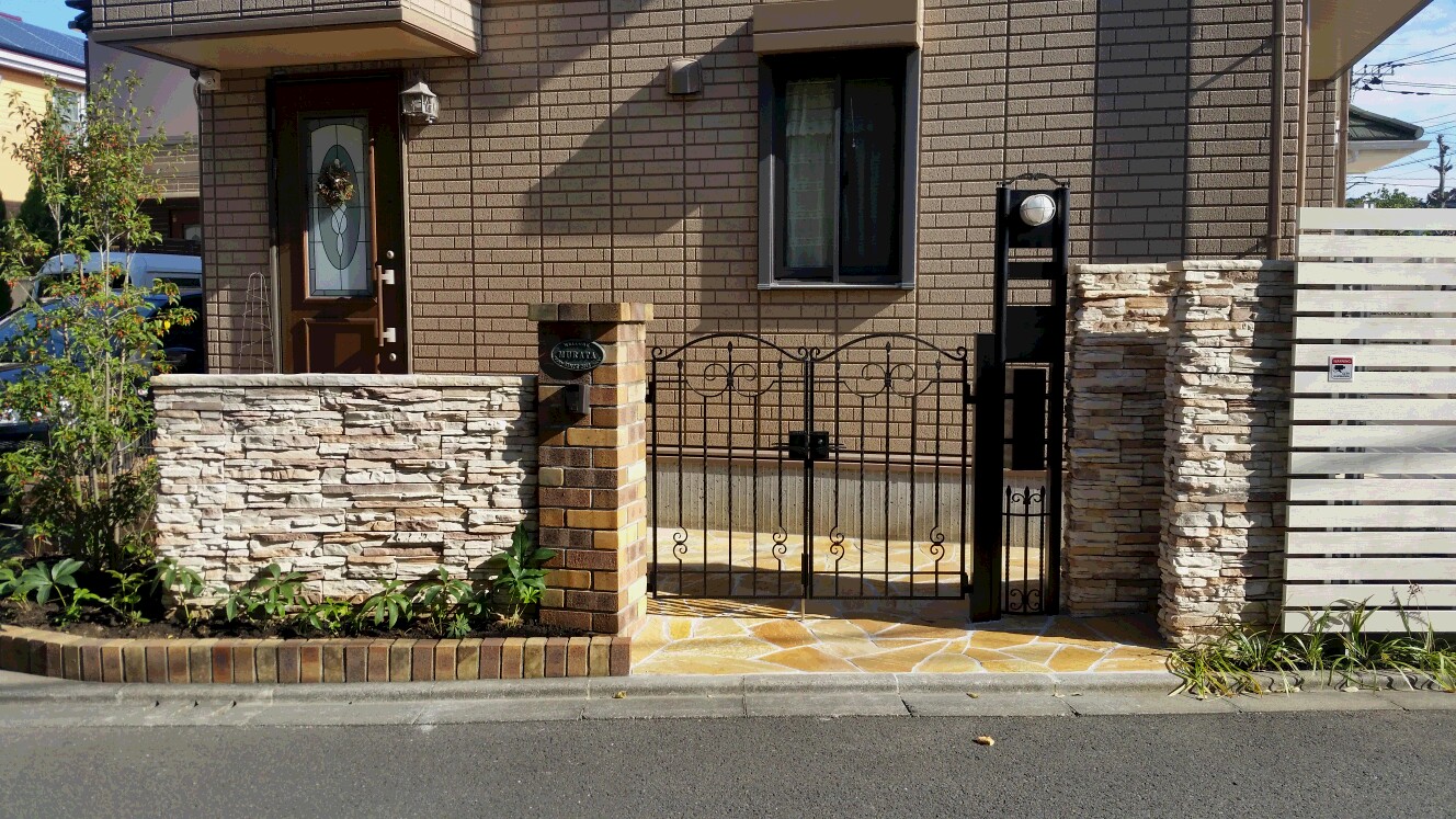 レンガに相性の良い石積み風の袖壁に鋳物の門扉を組み合わせました。塀や門扉を作るにもいろんなデザインが考えられます、インターホンやポストをどうするか、既存であったレンガ門柱を活かす方法を考え、新しく作る工作物の高さや配列に気を使いました。
