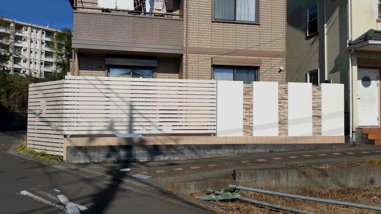 落ち着いた色合いの目隠しフェンスとデザイン性のある塀によって以前とは見える景色がガラッと変わりました。