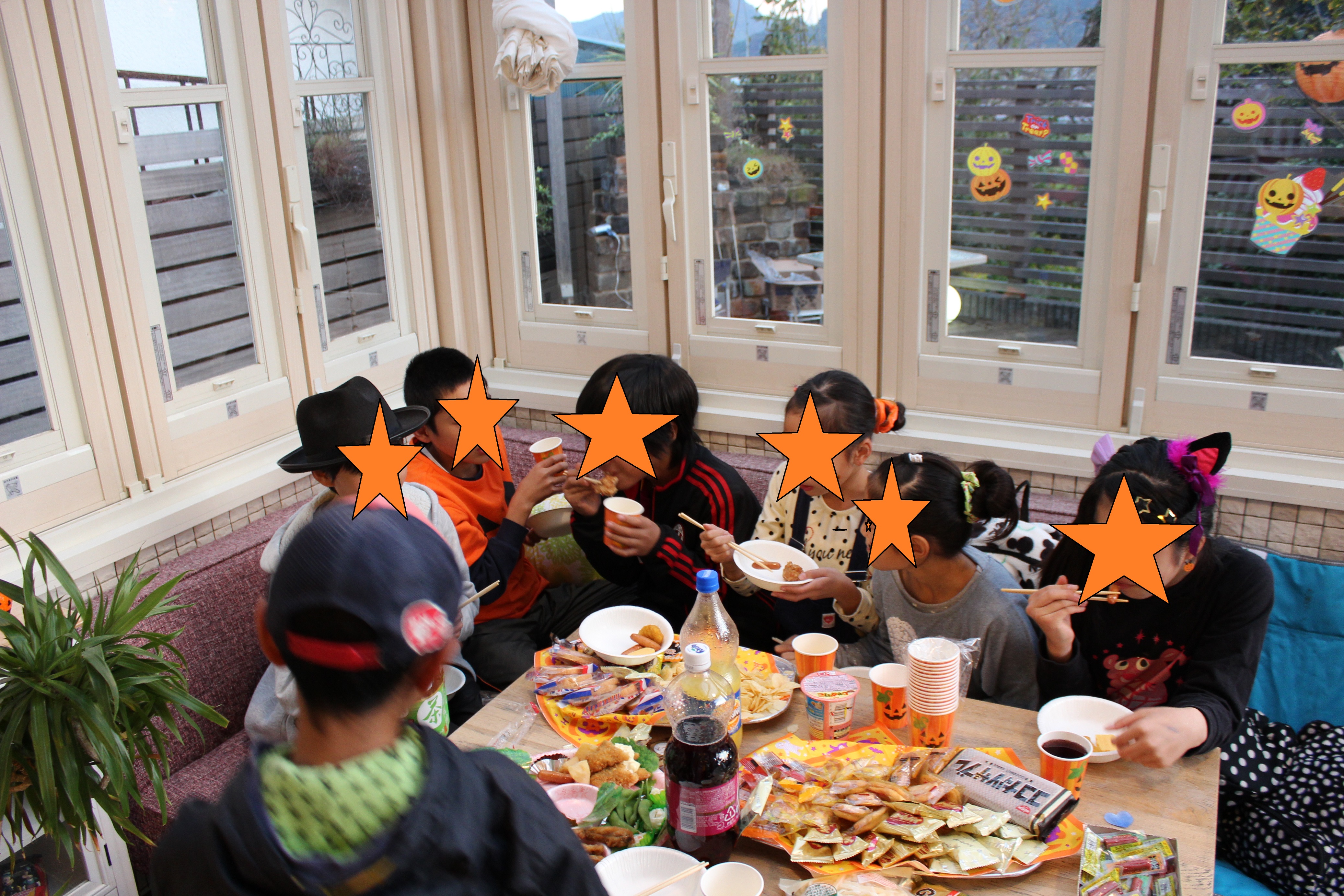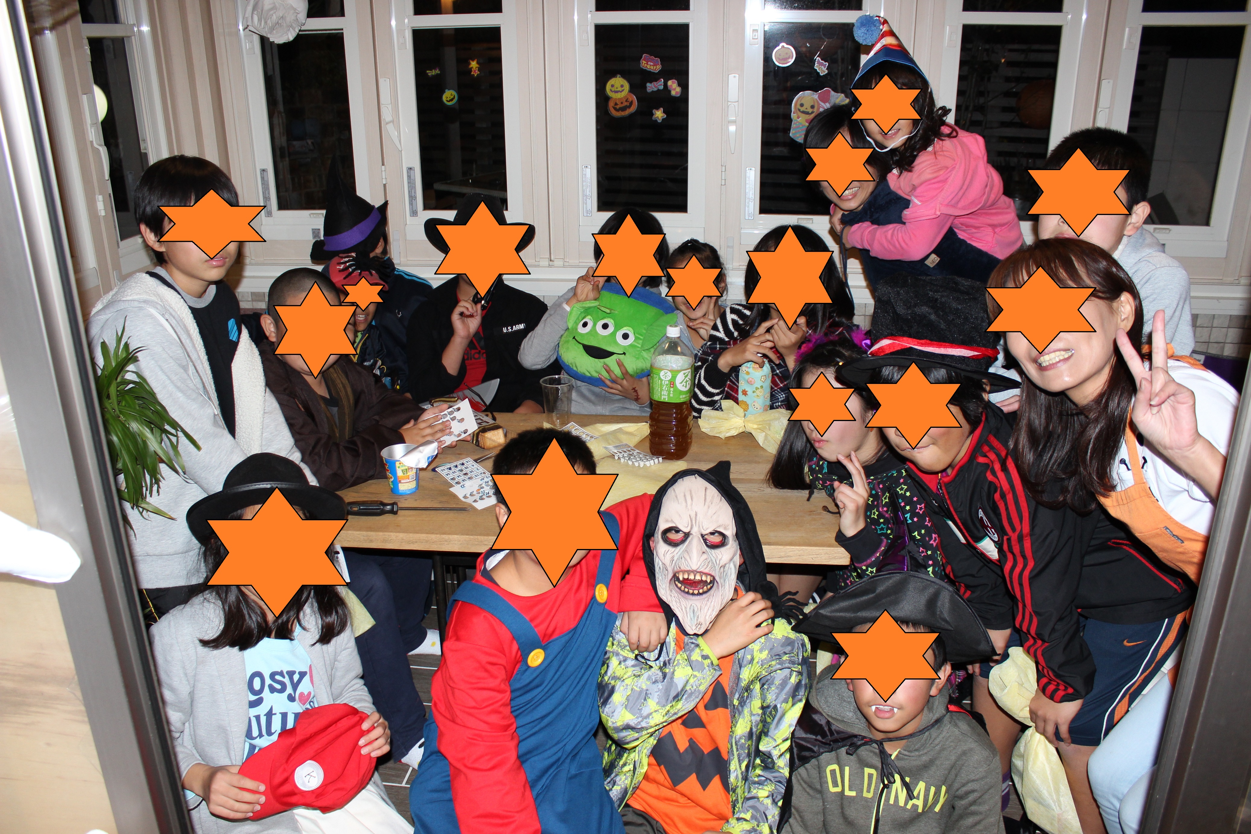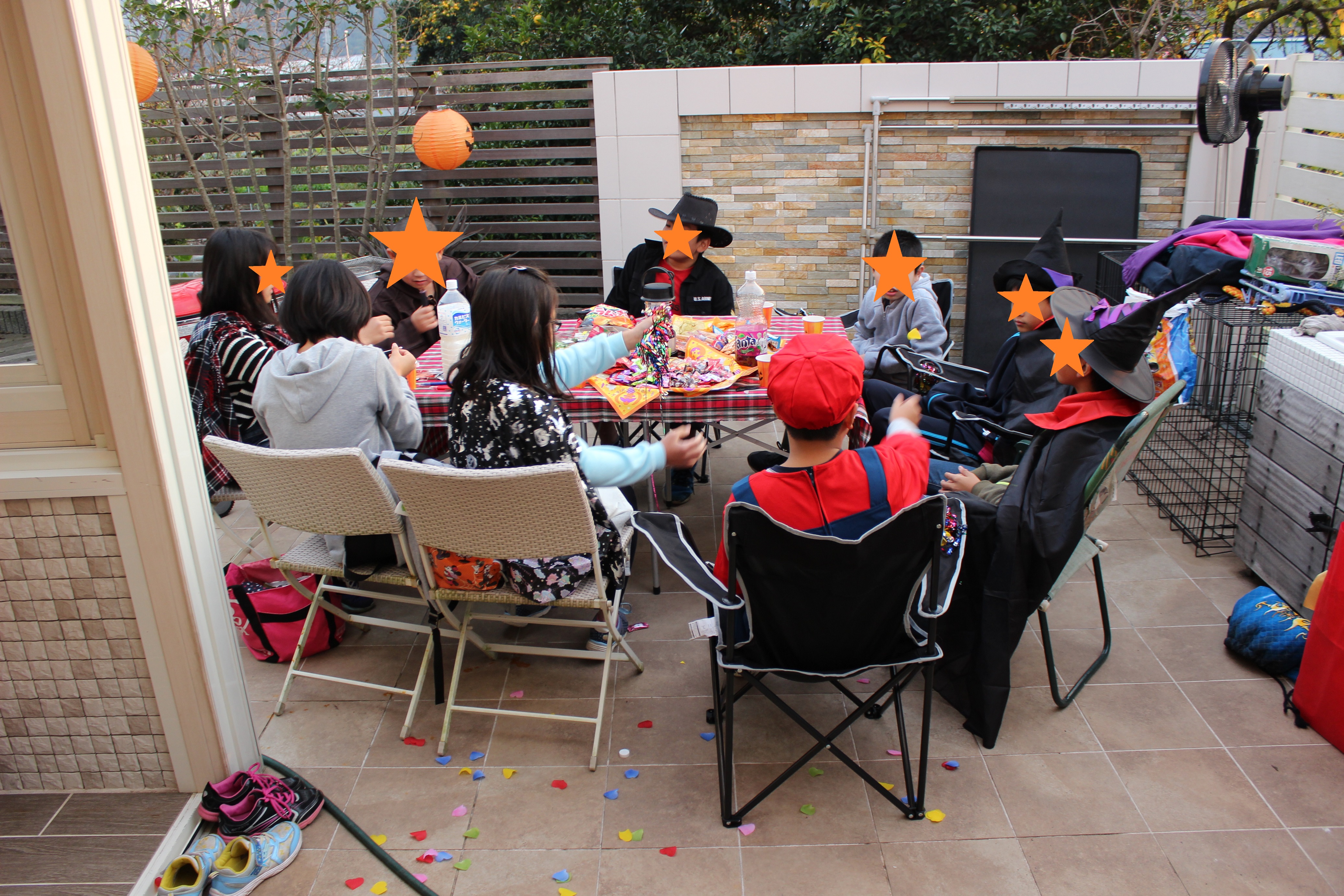 学校が終わった子供たちが集まり、皆で持ち寄ったお菓子の数が凄いのなんのって(笑)準備が出来たところでジュース片手にハッピーハロウィン!