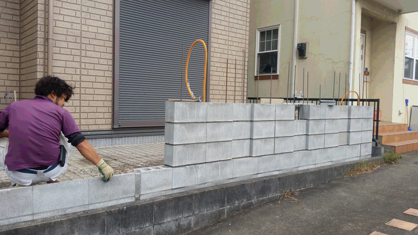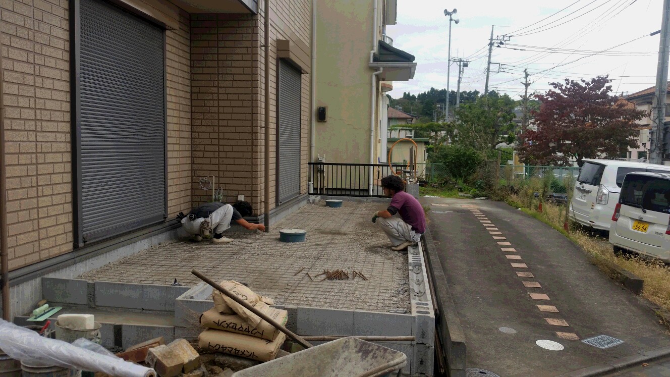 ブロック下地が完成!次は下地のコンクリート打ちです、この作業でタイルの平坦性が決まってくるのでコンクリートの仕上がり高さに印を入れて生コンを丁寧に均します。