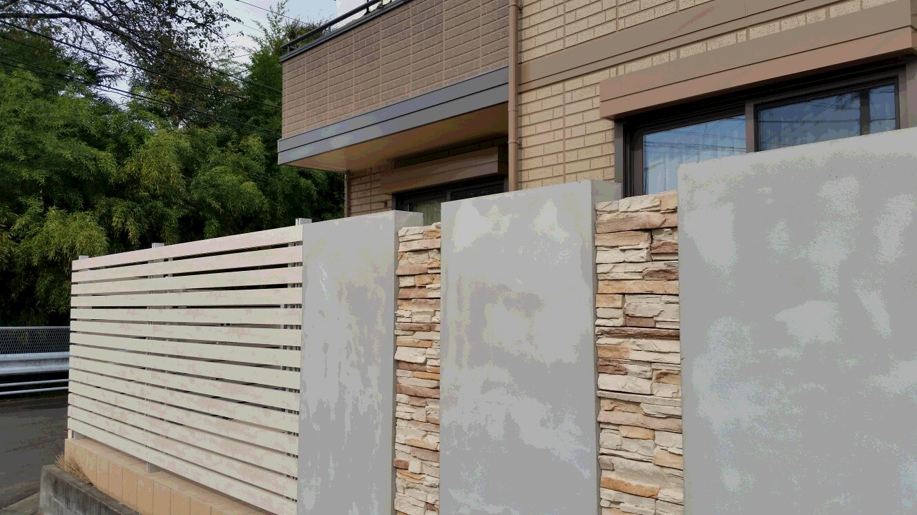 下地が完成した段階でお客様と確認立会いを行い、タイルの色、目地の色を決めています。そうすることで打合せの段階では説明できない構造物のボリュームを感じることができ、リビングからの見た目もイメージして色合いを選択することができます。次に仕上がりの確認で現場に行くと、塀の石貼りや目隠しフェンスの施工もだいぶ進んでいました。
