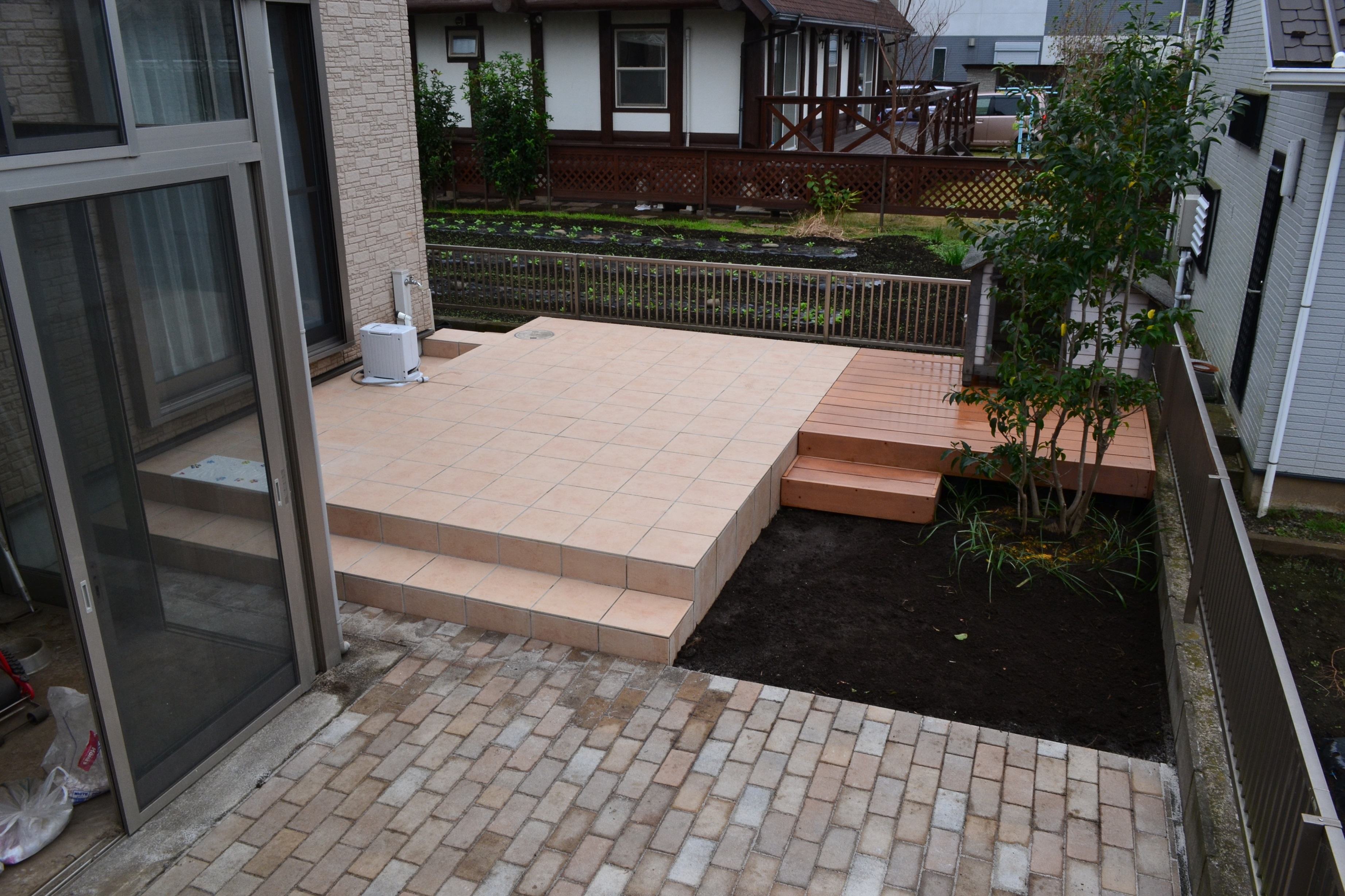 今あるデッキでは使い勝手が良くないとの事でしたので、広めのタイルテラスを提案、せっかくあるデッキですからタイルのテラスと連結させて再利用、広くなった分BBQの時などファニチャー等沢山設置することが出来るようにしました。