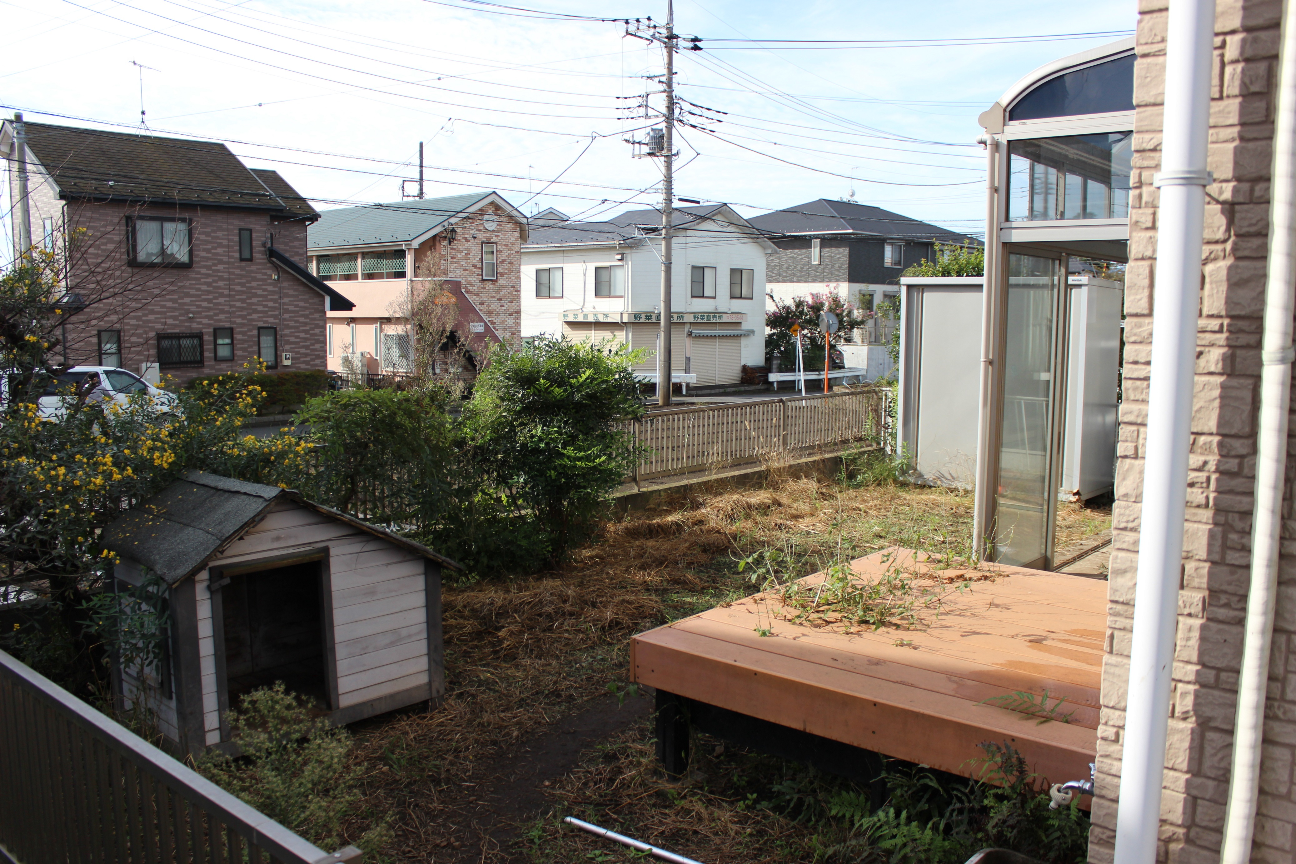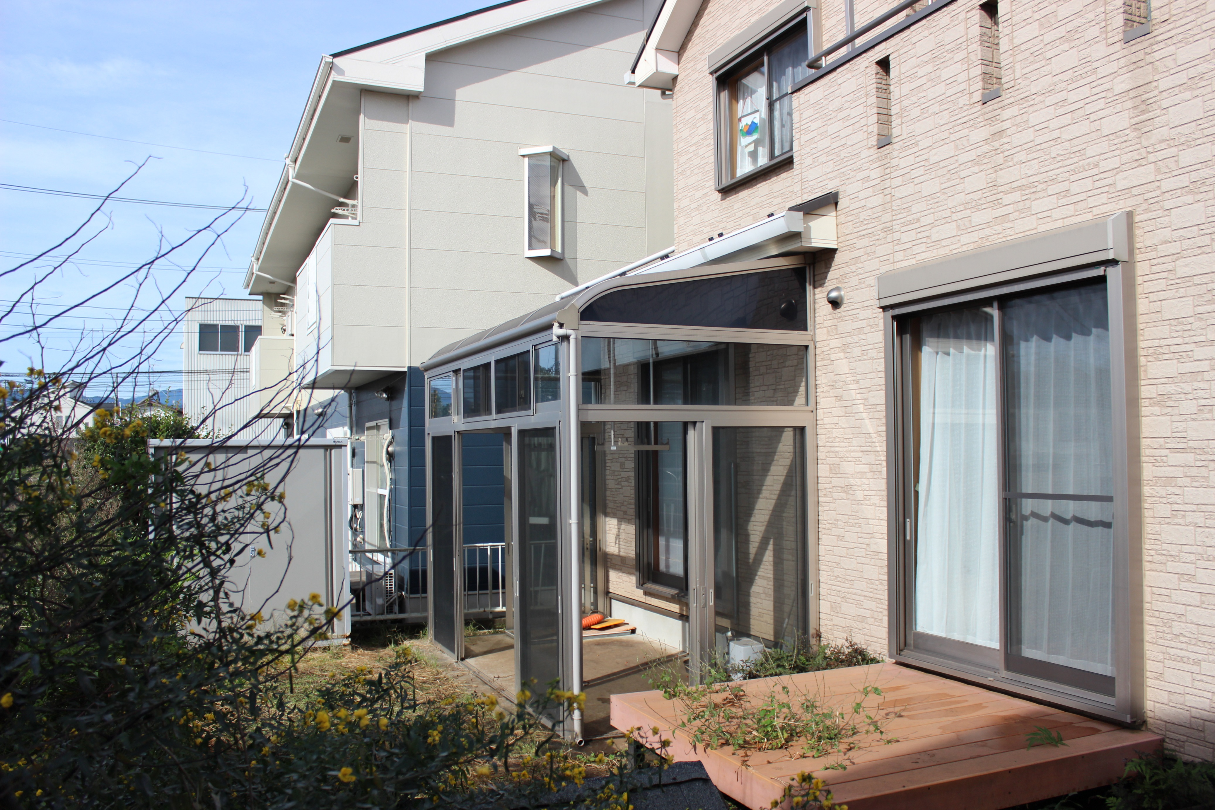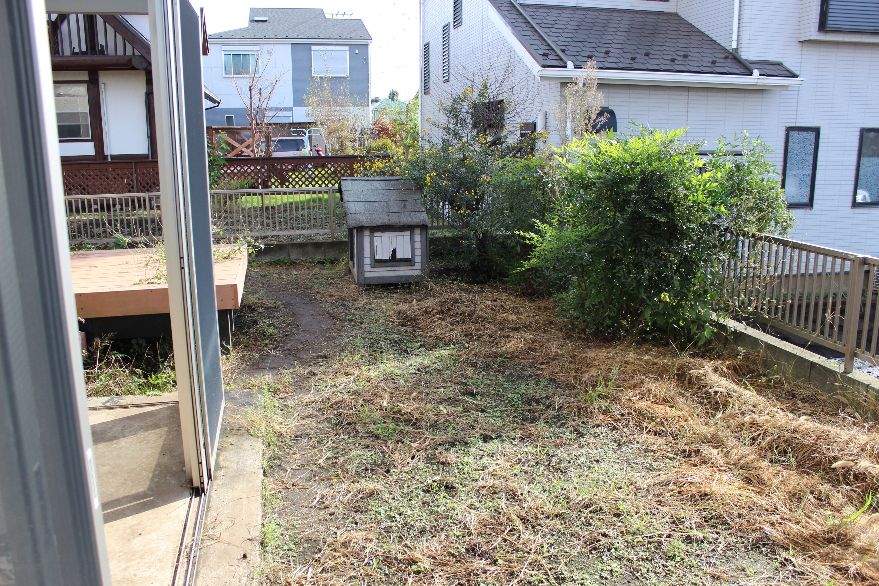 本題のお庭は、ワンコ用にサンルームが設置され、リビング前には樹脂製のデッキがありました。