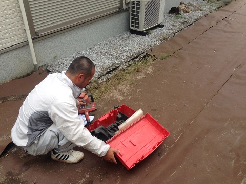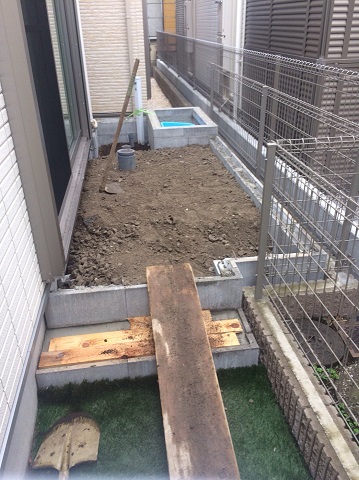 お庭にタイルテラスができます(^◇^)担当は敬一君(^○^)残りの職人たちもタイルテラスを最初から最後までできる弊社の頼もしいスタッフです(*^^)v