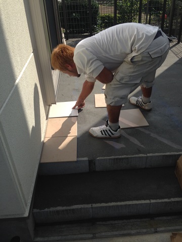 お施主様との立会いを円滑に進めるために下地まで作ってある状態から事前にタイルを仮り並べていきます(^○^)弊社職人敬一君が手際よくタイルを置いていってくれていますね(^_^)/