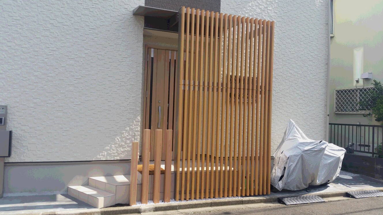 玄関前は、ポーチを降りるとすぐに道路!袖壁にしたのでは圧迫感があり過ぎる、でも何かアクセントがほしいというご希望に、格子タイプのパネルをご提案