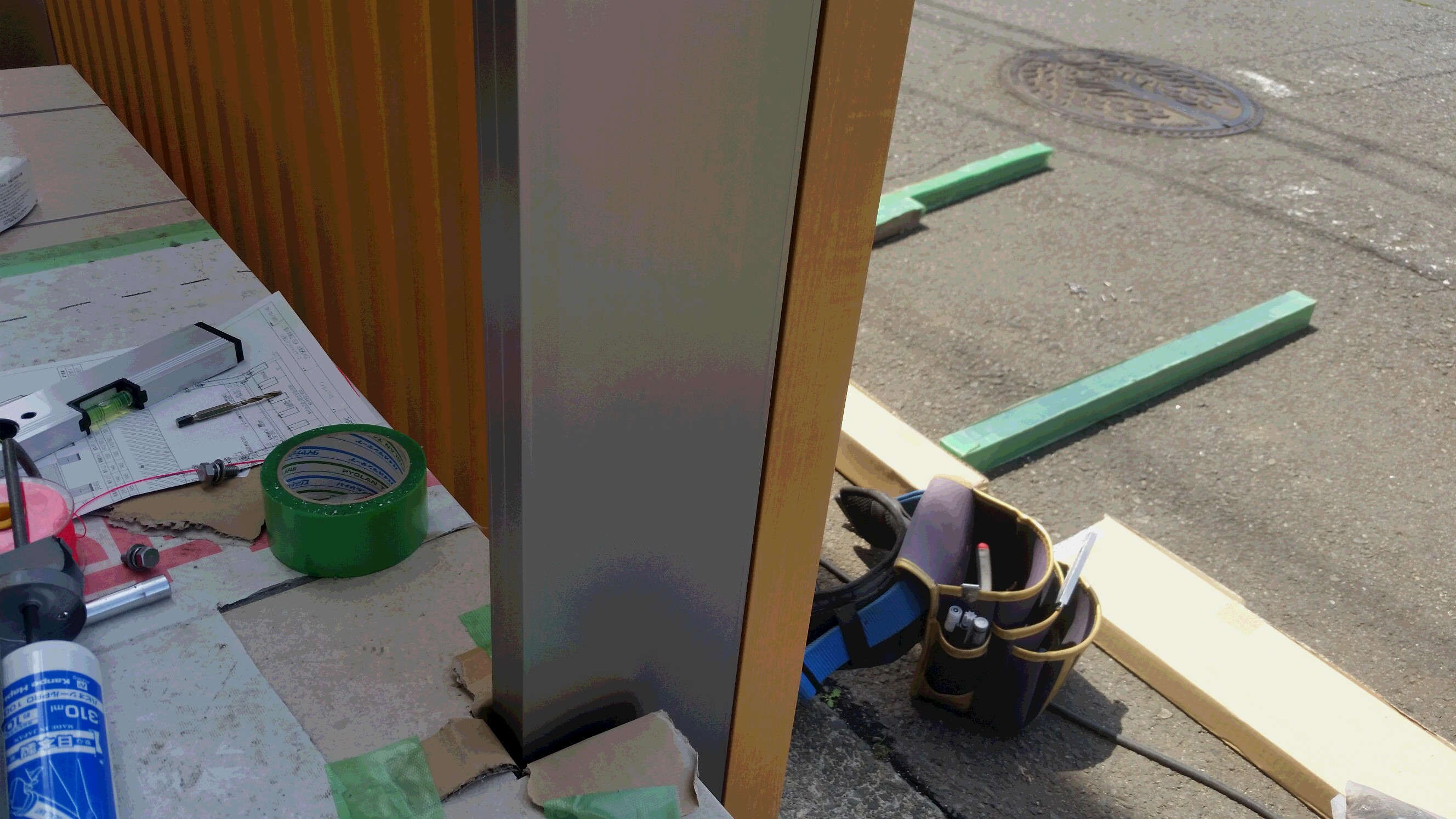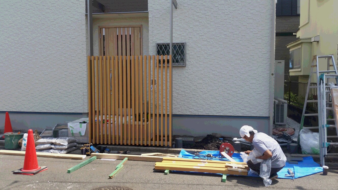 格子パネルをずらした部分には、アクセントのポールが数本入る予定ですが、高さによっては圧迫感を感じてしまう為、施主様と立ち会いながら調整します。
